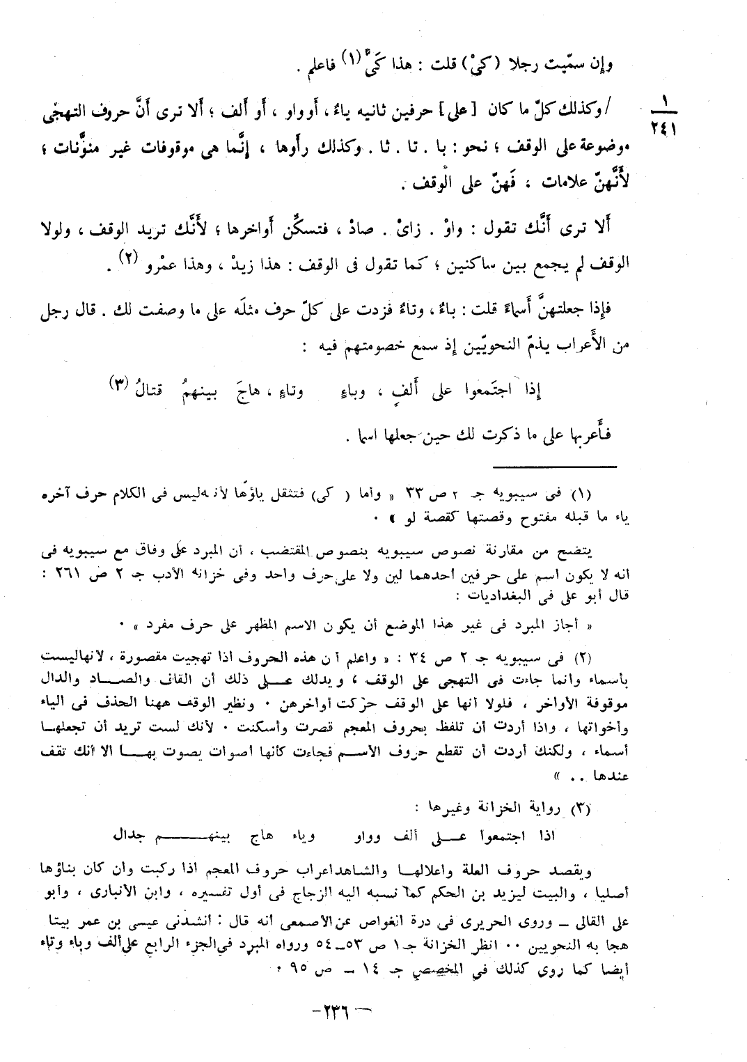 وإِن سمّيت رجلا (كيْ) قلت هَذَا كيٌّ فَاعْلَم / وَكَذَلِكَ كلّ مَا كَانَ {على} حرفين ثَانِيه ياءٌ أَو وَاو أَو أَلف أَلا ترى أَنَّ حرفين التهجي مَوْضُوعَة على الْوَقْف نَحْو با تا ثا وَكَذَلِكَ رأَوها إِنَّما هِيَ موقوفات غير منونَّات لأَنَّهنّ عَلَامَات فَهنّ على الْوَقْف أَلا ترى أَنَّك تَقول واوْ زايْ صادْ فتسكِّن أَواخرها لأَنَّك تُرِيدُ الْوَقْف وَلَوْلَا الْوَقْف لم يجمع بَين ساكنين كَمَا تَقول فِي الْوَقْف هَذَا زيدْ وَهَذَا عمْرو فإِذا جعلتهنَّ أَسماءً قلت باءٌ وتاءٌ فزدت على كلّ حرف مثلَه على مَا وصفت لَك قَالَ رجل من الأَعراب يذمّ النحويّين إِذ سمع خصومتهم فِيهِ