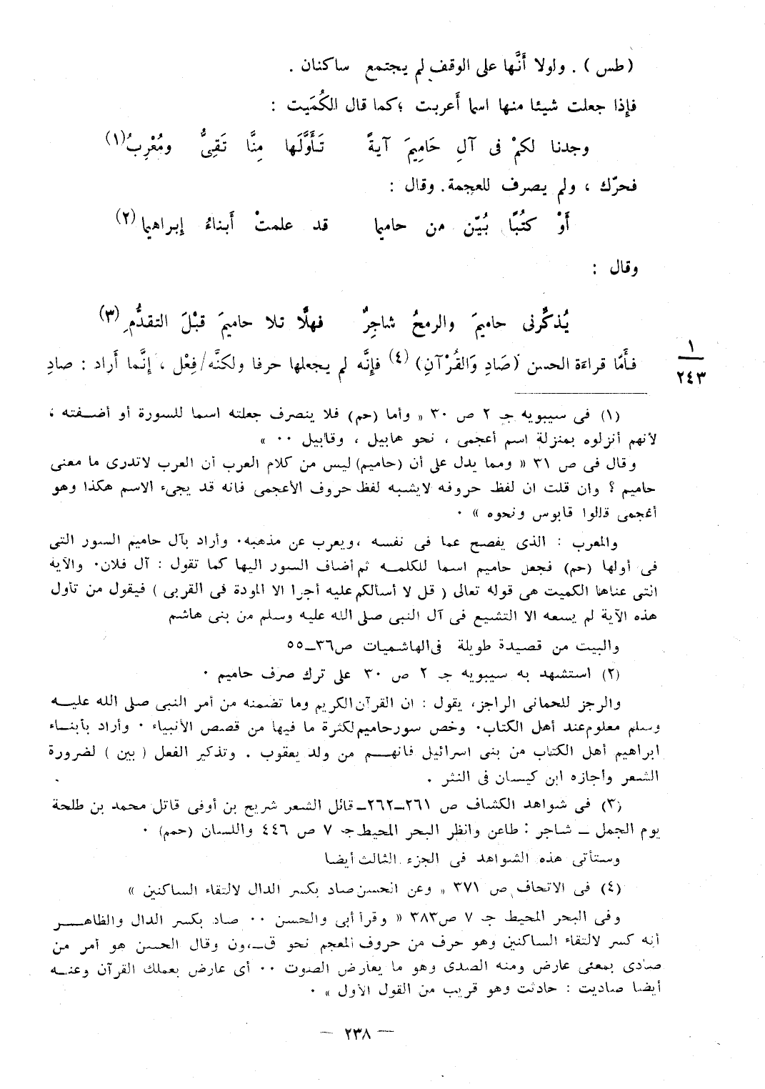 (طس) وَلَوْلَا أَنَّها على الْوَقْف لم يجْتَمع ساكنان فإِذا جعلت شَيْئا مِنْهَا اسْما أَعربت كَمَا قَالَ الكُمَيت