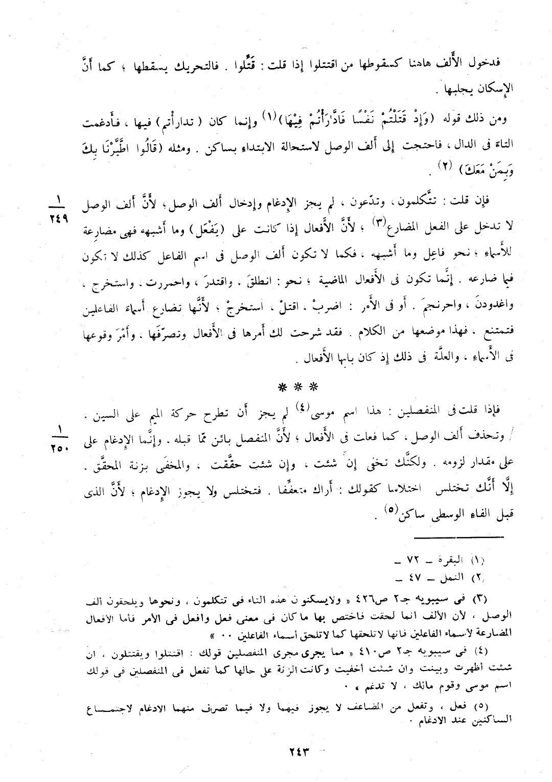 فدخول الأَلف هَاهُنَا كسقوطها من اقْتَتَلُوا إِذا قلت قَتَّلوا فالتحريك يُسْقِطهَا كَمَا أَنَّ الإِسكان يجلبها وَمن ذَلِك قَوْله {وَإِذ قتلتم نفسا فادارأتم فِيهَا} وإِنما كَانَ (تدارأْتم) فِيهَا فأَدغمت التاءَ فِي الدَّال فَاحْتَجت إِلى أَلف الْوَصْل لِاسْتِحَالَة الابتداءِ بساكن وَمثله {قَالُوا اطيرنا بك وبمن مَعَك} فإِن قلت تتَّكلمون وتدّعون لم يجز الإِدغام وإِدخال أَلف الْوَصْل لأَنَّ أَلف الْوَصْل لَا تدخل على الْفِعْل الْمُضَارع لأَنَّ الأَفعال إِذا كَانَت على (يَفْعَل) وَمَا أَشبهه فَهِيَ مضارعة للأَسماءِ نَحْو فاعِل وَمَا أَشبهه فَكَمَا لَا تكون أَلف الْوَصْل فِي اسْم الْفَاعِل كَذَلِك لَا تكون فِيمَا ضارعه إِنَّما تكون فِي الأَفعال الْمَاضِيَة نَحْو انطلقَ واقتدرَ واحمررت واستخرج واغدودنَ واحرنجمَ أَو فِي الأَمر اضربْ اقتلْ استخرجْ لأَنَّها تضارع أَسماءَ الفاعلين فتمتنع فَهَذَا موضعهَا من الْكَلَام فقد شرحت لَك أَمرها فِي الأَفعال وتصرّفَها وأَمْرَ وُقُوعهَا فِي الأَسماءِ والعلَّة فِي ذَلِك إِذ كَانَ بَابهَا الأَفعال فإِذا قلت فِي المنفصلين هَذَا اسْم مُوسَى لم يجز أَن تطرح حَرَكَة الْمِيم على السِّين / وتحذف أَلف الْوَصْل كَمَا فعلت فِي الأَفعال لأَنَّ الْمُنْفَصِل بَائِن ممّا قبله وإِنَّما الإِدغام على مِقْدَار لُزُومه ولكنَّك تخفي إِن شِئْت وإِن شِئْت حقَّقت والمخفَى بزنة المحقَّق إِلاَّ أَنَّك تختلس اختلاسا كَقَوْلِك أَراك متعفِّفا فتختلس وَلَا يجوز الإِدغام لأَنَّ الَّذِي قبل الفاءِ الْوُسْطَى سَاكن