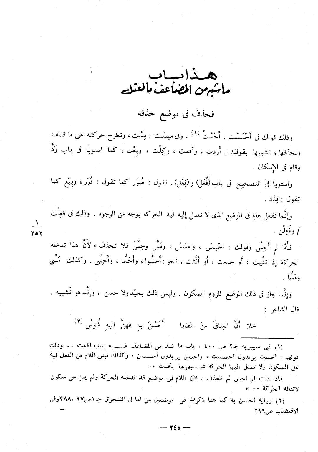 وَذَلِكَ قَوْلك فِي أَحْسَسْت أَحَسْتُ وَفِي مسِسْت مِسْت وتطرح حركته على مَا قبله وتحذفها تَشْبِيها بِقَوْلِك أَردت وأَقمت وكِلت وبِعْت كَمَا اسْتَويَا فِي بَاب رَدَّ وَقَامَ فِي الإِسكان واستويا فِي التَّصْحِيح فِي بَاب (فُعَل) و (فِعَل) تَقول صُوَر كَمَا تَقول دُرَر وبِيَع كَمَا تَقول قِدَد وإِنَّما تفعل هَذَا فِي الْموضع الَّذِي لَا تصل إِليه فِيهِ الْحَرَكَة بِوَجْه من الْوُجُوه وَذَلِكَ فِي فعِلْت / وفَعِلْن فأَمّا لم أَحِسَّ وقولك احْسِسْ وامسَسْ ومَسَّ وحِسَّ فَلَا تحذف لأَنَّ هَذَا تدخله الْحَرَكَة إِذا ثنَّيت أَو جمعت أَو أَنَّثت نَحْو أَحسُّوا وأَحَسَّا وأَحِسَّى وَكَذَلِكَ مَسِّى ومَسَّا وإِنَّما جَازَ فِي ذَلِك الْموضع للُزُوم السّكُون وَلَيْسَ ذَلِك بجيّد وَلَا حسن وإِنَّما هُوَ تَشبيه قَالَ الشَّاعِر