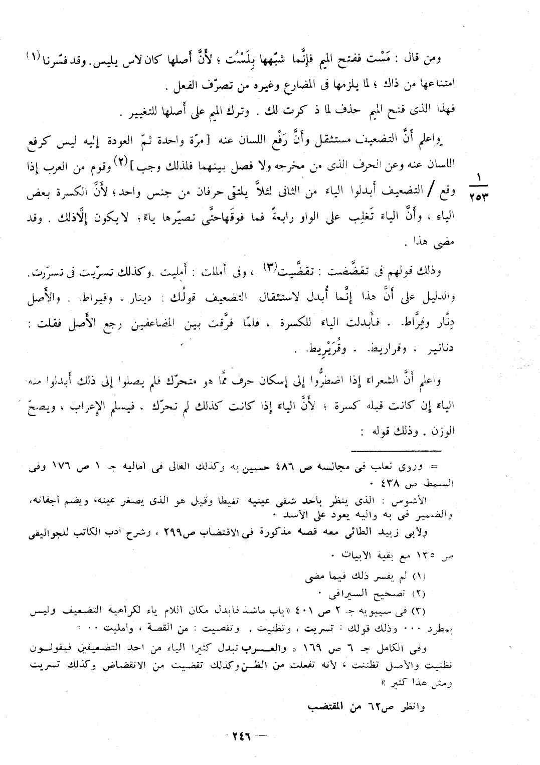 وَمن قَالَ مَسْت فَفتح الْمِيم فإِنَّما شبّهها بِلَسْتُ لأَنَّ أَصلها كَانَ لاس يليس وَقد فسّرنا امتناعها من ذَاك لما يلْزمهَا فِي الْمُضَارع وَغَيره من تصرّف الْفِعْل فَهَذَا الَّذِي فتح الْمِيم حذف لما ذكرت لَك وَترك الْمِيم على أَصلها للتغيير وَاعْلَم أَنَّ التَّضْعِيف مستثقل وأَنَّ رَفْع اللِّسَان عَنهُ {مرّة وَاحِدَة ثمّ العودة إِليه لَيْسَ كرفع اللِّسَان عَنهُ وَعَن الْحَرْف الَّذِي من مخرجه وَلَا فصل بَينهمَا فَلذَلِك وَجب} وَقوم من الْعَرَب إِذا وَقع / التَّضْعِيف أَبدلوا الياءَ من الثَّانِي لئلاَّ يلتقي حرفان من جنس وَاحِد لأَنَّ الكسرة بعض الياءِ وأَنَّ الياءَ تَغلِب على الْوَاو رَابِعَة فَمَا فَوْقهَا حتَّى تصيّرها يَاء لَا يكون إِلاَّ ذَلِك وَقد مضى هَذَا وَذَلِكَ قَوْلهم فِي تقضَّضت تقضَّيت وَفِي أَمللت أَمليت وَكَذَلِكَ تسرّيت فِي تسرّرت وَالدَّلِيل على أَنَّ هَذَا إِنَّما أُبدل لاستثقال التَّضْعِيف قولُك دِينَار وقيراط والأَصل دِنَّار وقِرَّاط فأَبدلت الياءَ للكسرة فلمّا فرَّقت بَين المضاعفين رَجَعَ الأَصل فَقلت دَنَانِير وقراريط وقُرَيْرِيط وَاعْلَم أَنَّ الشعراءَ إِذا اضطِرُّوا إِلى إِسكان حرف ممَّا هُوَ متحرّك فَلم يصلوا إِلى ذَلِك أَبدلوا مِنْهُ الياءَ إِن كَانَت قبله كسرة لأَنَّ الياءَ إِذا كَانَت كَذَلِك لم تحرّك فَيسلم الإِعراب ويصحّ الْوَزْن وَذَلِكَ قَوْله