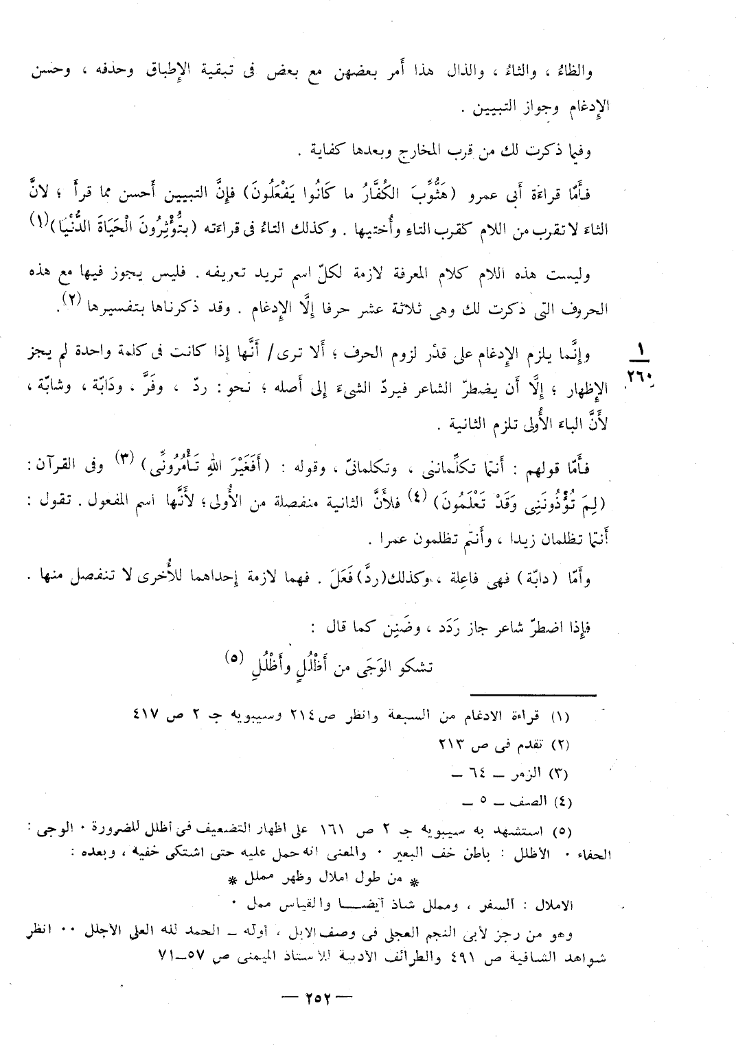 والظاءُ والثاءُ والذال هَذَا أَمر بَعضهنَّ مَعَ بعض فِي تبقية الإِطباق وحذفه وَحسن الإِدغام وَجَوَاز التَّبْيِين وَفِيمَا ذكرت لَك من قرب المخارج وَبعدهَا كِفَايَة فأَمّا قراءَة أَبي عَمْرو {هَثُّوِّبَ الكُفَّارُ مَا كَانُوا يَفْعَلُونَ} فإِنَّ التَّبْيِين أَحسن مِمَّا قرأَ لأنَّ الثاءَ لَا تقرب من اللَّام كقرب التاءِ وأُختيها وَكَذَلِكَ التاءُ فِي قراءَته {بتُّؤْثِرُونَ الحَيَاةَ الدُّنْيَا} وَلَيْسَت هَذِه اللَّام كَلَام الْمعرفَة لَازِمَة لكلّ اسْم تُرِيدُ تَعْرِيفه فَلَيْسَ يجوز فِيهَا مَعَ هَذِه الْحُرُوف الَّتِي ذكرت لَك وَهِي ثَلَاثَة عشر حرفا إِلاَّ الإِدغام وَقد ذكرنَا بتفسيرها وإِنَّما يلْزم الإِدغام على قدْر لُزُوم الْحَرْف أَلا ترى / أَنَّها إِذا كَانَت فِي كلمة وَاحِدَة لم يجز الإِظهار إِلاَّ أَن يضطرّ الشَّاعِر فيردّ الشيءَ إِلى أَصله نَحْو ردَّ وفَرَّ ودَابّة وشابّة لأَنَّ الباءَ الأُولى تلْزم الثَّانِيَة فأَمَّا قَوْلهم أَنتما تكلِّمانني وتكلمانيّ وَقَوله {أفغير الله تأمروني} وَفِي الْقُرْآن {لم تؤذونني وَقد تعلمُونَ} فلأَنَّ الثَّانِيَة مُنْفَصِلَة من الأُولى لأَنَّها اسْم الْمَفْعُول تَقول أَنتما تظلمان زيدا وأَنتم تظْلمُونَ عمرا وأَمّا (دابّة) فَهِيَ فاعِلة وَكَذَلِكَ (ردَّ) فَعَلَ فهما لَازِمَة إِحداهما للأُخرى لَا تنفصل مِنْهَا فإِذا اضطرّ شَاعِر جَازَ رَدَد وضَنِن كَمَا قَالَ