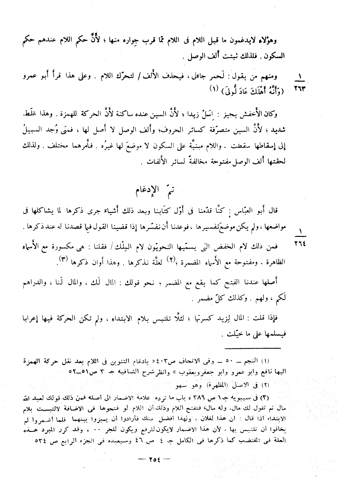 وهؤلاءِ لَا يدغمون مَا قبل اللَّام فِي اللَّام ممّا قرب جِواره مِنْهَا لأَنَّ حكم اللَّام عِنْدهم حكم السّكُون فَلذَلِك ثبتَتْ أَلف الْوَصْل وَمِنْهُم من يَقُول لَحمر جاءَني فيحذف الأَلف / لتحرّك اللَّام وعَلى هَذَا قرأَ أَبو عَمْرو {وَأَنَّهُ أَهْلَكَ عَادَ لُّوليَ} وَكَانَ الأَخفش يُجِيز اِسَلْ زيدا لأَنَّ السِّين عِنْده سَاكِنة لأَنَّ الْحَرَكَة للهمزة وَهَذَا غلَط شَدِيد لأَنَّ السِّين متصرّفة كَسَائِر الْحُرُوف وأَلف الْوَصْل لَا أَصل لَهَا فَمَتَى وُجد السَّبِيل إِلى إِسقاطها سَقَطت وَاللَّام مبنيَّة على السّكُون لَا موضعَ لَهَا غيرُه فأَمرها مُخْتَلف وَلذَلِك لحقتها أَلف الْوَصْل مَفْتُوحَة مُخَالفَة لسَائِر الأَلفات
