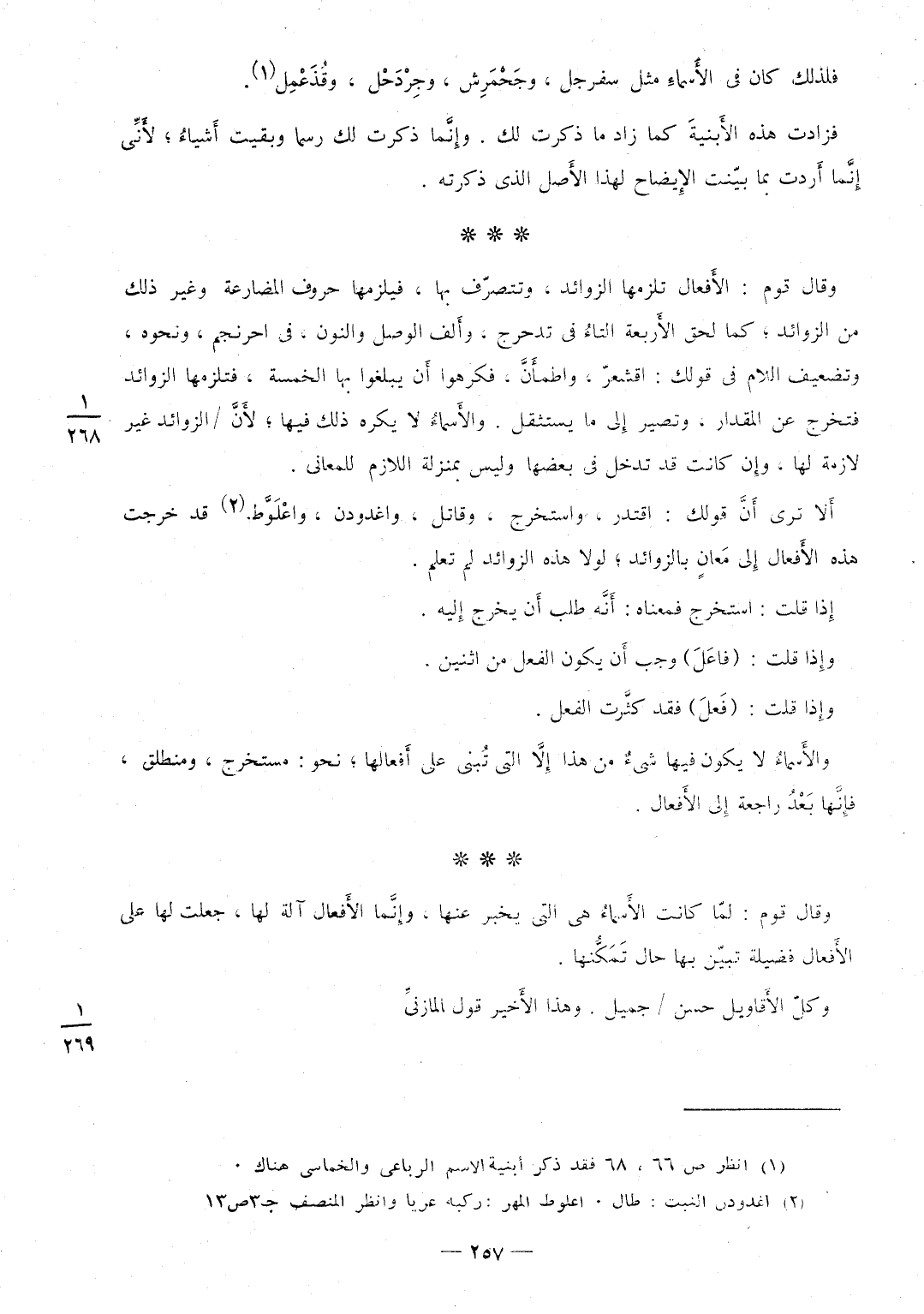 فَلذَلِك كَانَ فِي الأَسماءِ مثل سفرجل وجَحْمَرِش وجِرْدَحِل وقُذَعْمِل فزادت هَذِه الأَبنية كَمَا زَاد مَا ذكرت لَك وإِنَّما ذكرت لَك رسما وَبقيت أَشياءُ لأَنِّي إِنَّما أَردت بِمَا بيّنت الإِيضاح لهَذَا الأَصل الَّذِي ذكرته وَقَالَ قوم الأَفعال تلزمها الزَّوَائِد وتتصرّف بهَا فيلزمها حُرُوف المضارعة وَغير ذَلِك من الزَّوَائِد كَمَا لحق الأَربعة التاءُ فِي تدحرج وأَلف الْوَصْل وَالنُّون فِي احرنجم وَنَحْوه وتضعيف اللَّام فِي قَوْلك اقشعرّ واطمأَنَّ فكرهوا أَن يبلغُوا بهَا الْخَمْسَة فتلزمها الزَّوَائِد فَتخرج عَن الْمِقْدَار وَتصير إِلى مَا يستثقل والأَسماءُ لَا يكره ذَلِك فِيهَا لأَنَّ / الزَّوَائِد غير لَازِمَة لَهَا وإِن كَانَت قد تدخل فِي بَعْضهَا وَلَيْسَ بِمَنْزِلَة اللَّازِم للمعاني أَلا ترى أَنَّ قَوْلك اقتدر واستخرج وَقَاتل واغدودن واعْلَوَّط قد خرجت هَذِه الأَفعال إِلى مَعانٍ بالزوائد لَوْلَا هَذِه الزَّوَائِد لم تعلم إِذا قلت استخرج فَمَعْنَاه أَنَّه طلب أَن يخرج إِليه وَإِذا قلت: (فَاعل) وَجب أَن يكون الْفِعْل من اثْنَيْنِ وإِذا قلت (فاعَلَ) فقد كثَّرت الْفِعْل والأَسماءُ لَا يكون فِيهَا شيءٌ من هَذَا إِلاَّ الَّتِي تُبنى على أَفعالها نَحْو مستخرج ومنطلق فإِنَّها بَعْدُ رَاجِعَة إِلى الأَفعال وَقَالَ قوم لمّا كَانَت الأَسماءُ هِيَ الَّتِي يخبر عَنْهَا وإِنَّما الأَفعال آلَة لَهَا جعلت لَهَا على الأَفعال فَضِيلَة تبيّن بهَا حَال تَمَكُّنها وكلّ الأَقاويل حسن / جميل وَهَذَا الأَخير قَول المازنيِّ