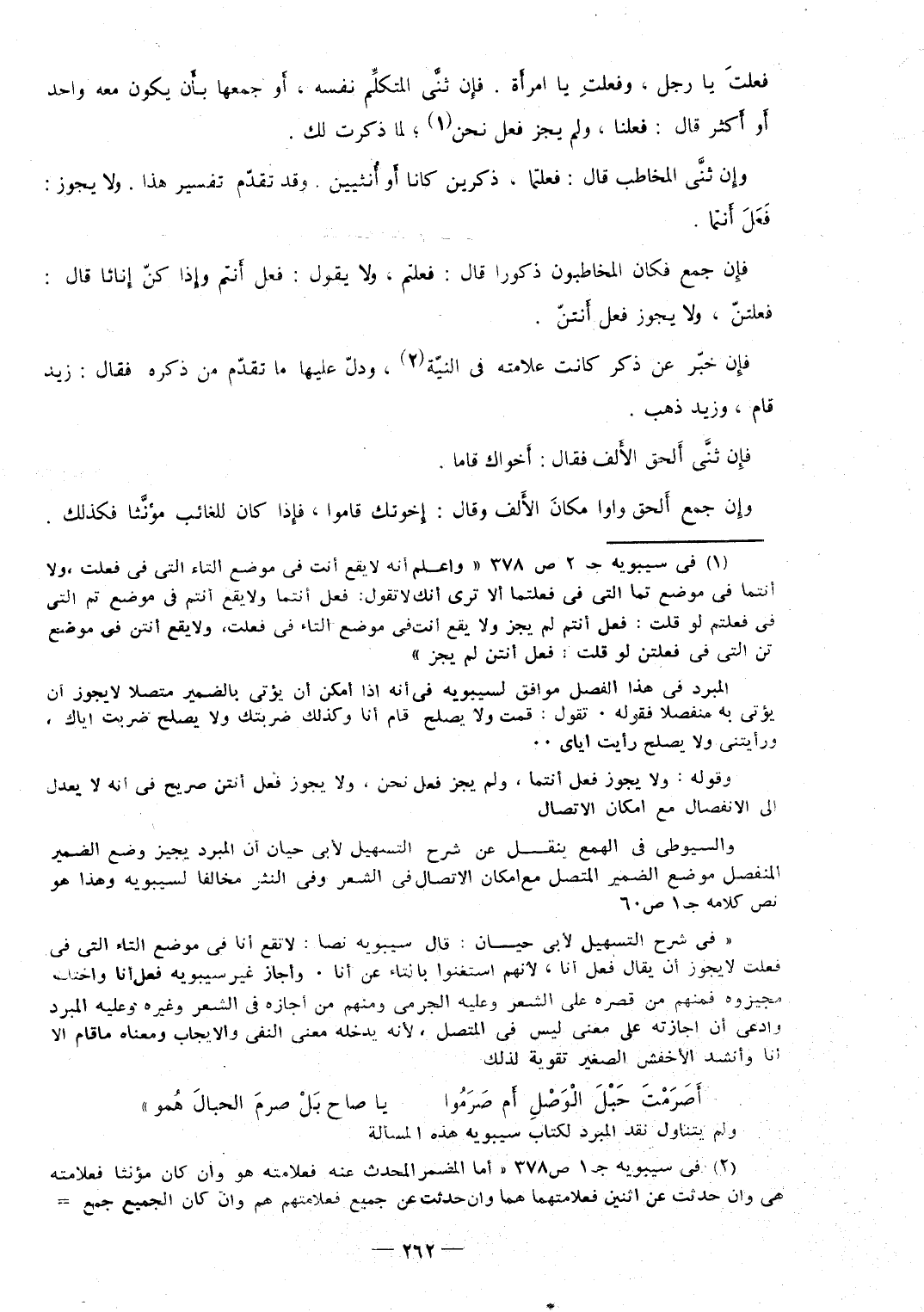 فعلتَ يَا رجل وفعلتِ يَا امرأَة فإِن ثنَّى المتكلِّم نَفسه أَو جمعهَا بأَن يكون مَعَه وَاحِد أَو أَكثر قَالَ فعلنَا وَلم يجز فعل نَحن لما ذكرت لَك وإِن ثنَّى الْمُخَاطب قَالَ فعلتما ذكرين كَانَا أَو أُنثيين وَقد تقدّم تَفْسِير هَذَا وَلَا يجوز فَعَلَ أَنتما فإِن جمع فَكَانَ المخاطبون ذُكُورا قَالَ فَعلْتُمْ وَلَا يَقُول فعل أَنتم وإِذا كنَّ إِناثا قَالَ فعلتنّ وَلَا يجوز فعل أَنتنّ فإِن خبّر عَن ذكر كَانَت علامته فِي النيّة ودلّ عَلَيْهَا مَا تقدّم من ذكره فَقَالَ زيد قَامَ وَزيد ذهب فإِن ثنَّى أَلحق الأَلف فَقَالَ أَخواك قاما وإِن جمع أَلحق واوا مكانَ الأَلف وَقَالَ إِخوتك قَامُوا فإِذا كَانَ للْغَائِب مؤنَّثا فَكَذَلِك