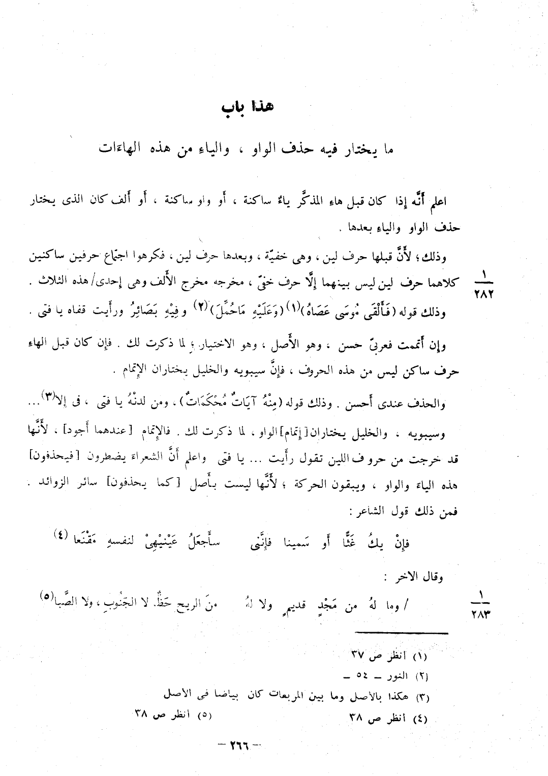 اعْلَم أَنَّه إِذا كَانَ قبل هاءِ المذكَّر ياءٌ سَاكِنة أَو وَاو سَاكِنة أَو أَلف كَانَ الَّذِي يخْتَار حذف الْوَاو والياءِ بعْدهَا وَذَلِكَ لأَنَّ قبلهَا حرف لين وَهِي خفيّة وَبعدهَا حرف لين فكرهوا اجْتِمَاع حرفين ساكنين كِلَاهُمَا حرف لين لَيْسَ بَينهمَا إِلاَّ حرف خفيّ مخرجه مخرج الأَلف وَهِي إِحْدَى / هَذِه الثَّلَاث وَذَلِكَ قَوْله {فَألْقى مُوسَى عَصَاهُ} {وَعَلَيْهِ مَا حُمِّلَ} وفِيْهِ بَصَائِرُ ورأَيت قَفاهُ يَا فَتى وإِن أَتممت فعربيّ حسن وَهُوَ الأَصل وَهُوَ الِاخْتِيَار لما ذكرت لَك فإِن كَانَ قبل الهاءِ حرف سَاكن لَيْسَ من هَذِه الْحُرُوف فإِنَّ سِيبَوَيْهٍ والخليل يختاران الإِتمام والحذف عِنْدِي أَحسن وَذَلِكَ قَوْله {مِنْهُ آيَات محكمات} وَمن لدْنهُ يَا فَتى فِي إِلا وسيبويه والخليل يختاران {إِتمام} الْوَاو لما ذكرت لَك فالإِتمام {عِنْدهمَا أَجود} لأَنَّها قد خرجت من حُرُوف اللين تَقول رأَيت يَا فَتى وَاعْلَم أَنَّ الشعراءَ يضطرون {فيحذفون} هَذِه الياءَ وَالْوَاو ويبقون الْحَرَكَة لأَنَّها لَيست بأَصل {كَمَا يحذفون} سَائِر الزَّوَائِد فَمن ذَلِك قَول الشَّاعِر
