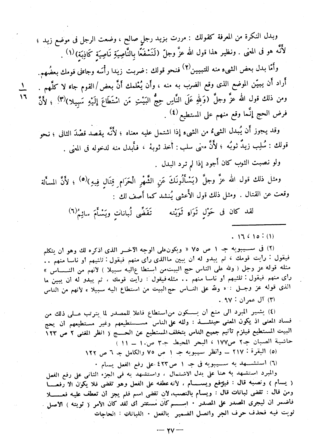 وَبدل النكرَة من الْمعرفَة كَقَوْلِك مَرَرْت بزيد رجلٍ صَالح وضعت الرجل فِي مَوضِع زيد لأَنَّه هُوَ فِي الْمَعْنى وَنَظِير هَذَا قَول الله عزَّ وجلّ {لنسفعا بالناصية نَاصِيَة كَاذِبَة} واَمَّا بدل بعض الشيءِ مِنْهُ للتبيين فنحو قَوْلك ضربت زيدا رأْسَه وجاءَني قَوْمك بعضُهم أَراد أَن يبيّن الْموضع الَّذِي وَقع الضَّرْب بِهِ مِنْهُ وأَن يُعْلمك أَنَّ بعض الْقَوْم جاءَ لَا كلَّهم وَمن ذَلِك قَول الله عزَّ وجلَّ {وَللَّه على النَّاس حج الْبَيْت من اسْتَطَاعَ إِلَيْهِ سَبِيلا} لأَن فرض الْحَج إِنَّما وَقع مِنْهُم على المستطيع وَقد يجوز أَن يُبدل الشيءُ من الشيءِ إِذا اشْتَمَل عَلَيْهِ مَعْنَاهُ لأَنَّه يقْصد قصْد الثَّانِي نَحْو قَوْلك سُلِب زيدٌ ثوبُه لأَنَّ معنى سلب أَخذ ثَوْبه فأَبدل مِنْهُ لدُخُوله فِي الْمَعْنى وَلَو نصبت الثَّوْب كَانَ أَجود إِذا لم ترد الْبَدَل وَمثل ذَلِك قَول الله عزَّ وجلَّ {يَسْأَلُونَك عَن الشَّهْر الْحَرَام قتال فِيهِ} لأَنَّ المسأَلة وَقعت عَن الْقِتَال وَمثل ذَلِك قَول الأَعشى يُنشد كَمَا أَصف لَك