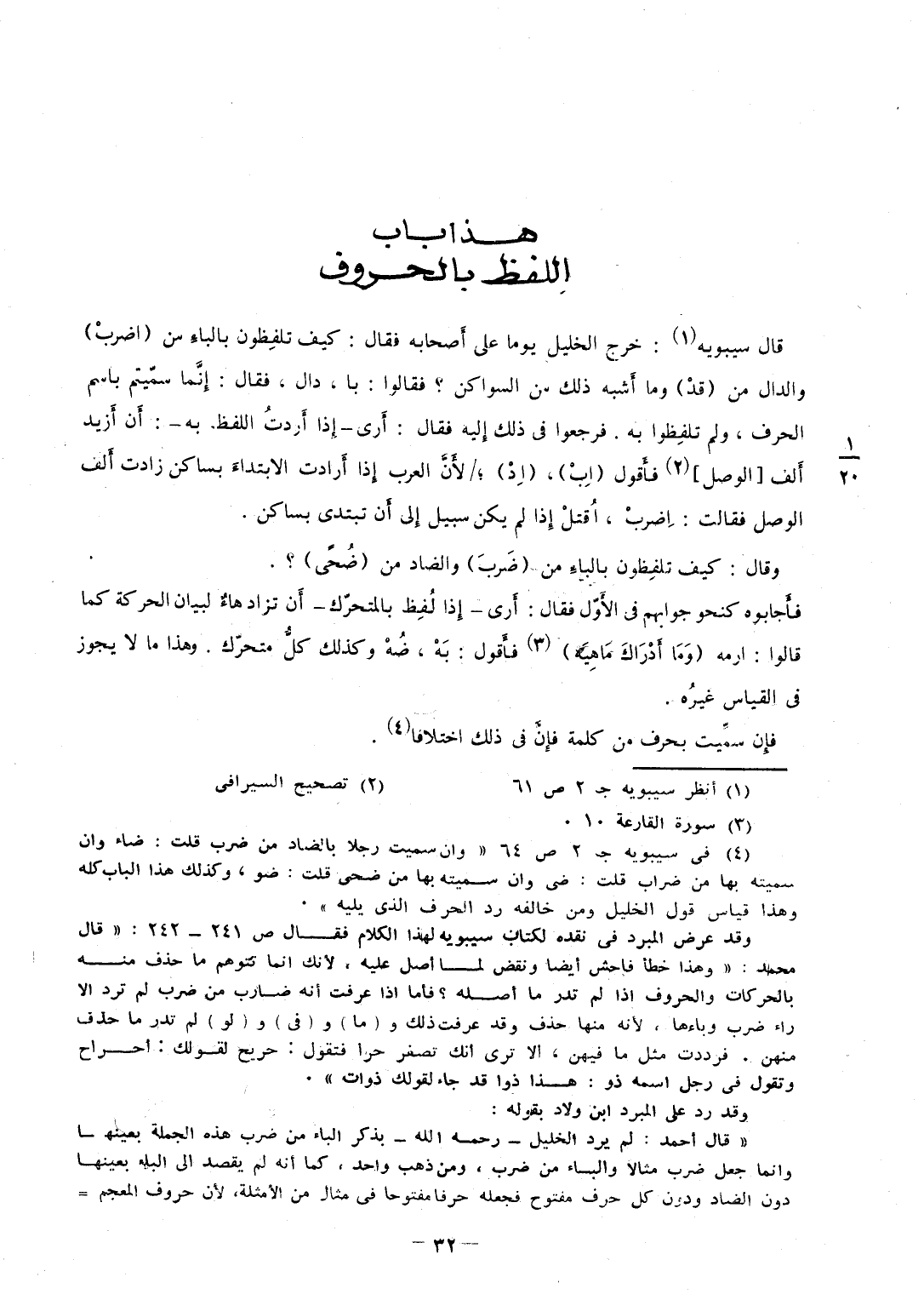 قَالَ سِيبَوَيْهٍ خرج الْخَلِيل يَوْمًا على أَصحابه فَقَالَ كَيفَ تلفِظون بالباءِ من اضربْ وَالدَّال من قدْ وَمَا أَشبه ذَلِك من السواكن فَقَالُوا با دَال فَقَالَ إِنَّما سمّيتم باسم الْحَرْف وَلم تلفِظوا بِهِ فَرَجَعُوا فِي ذَلِك إِليه فَقَالَ أَرى إِذا أَردت اللَّفْظ بِهِ أَن أَزيد أَلف الْوَصْل فأَقول اِبْ اِد / لأَن الْعَرَب إِذا أَرادت الِابْتِدَاء بساكن زَادَت أَلف الْوَصْل فَقَالَت اِضرب اُقتل إِذا لم يكن سَبِيل إِلى أَن تبتدي بساكن وَقَالَ كَيفَ تلفِظون بالباءِ من ضَربَ وَالضَّاد من ضُحىً فأَجابوه كنحو جوابهم فِي الأَول فَقَالَ أَرى إِذا لُفِظ بالمتحرّك أَن تزاد هاءٌ لبَيَان الْحَرَكَة كَمَا قَالُوا ارمه {وَمَا أَدْرَاكَ مَاهِيَه} فأَقول بَهْ ضُهْ وَكَذَلِكَ كلُّ متحرّك وَهَذَا مَا لَا يجوز فِي الْقيَاس غيرُه فإِن سميَّت بِحرف من كلمة فإِنَّ فِي ذَلِك اخْتِلَافا