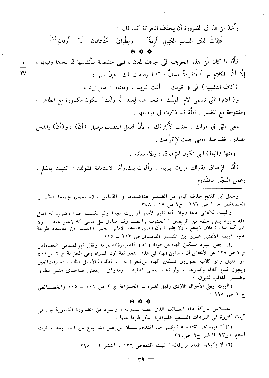 فأَمّا مَا كَانَ من هَذِه الْحُرُوف الَّتِي جَاءَت لمعان فَهِيَ مُنْفَصِلَة بأَنفسها ممّا بعْدهَا وَقبلهَا إِلاّ أَنَّ الْكَلَام بهَا مُنْفَرِدَة محَال كَمَا وصفت لَك فإِنَّ مِنْهَا كَاف التَّشْبِيه الَّتِي فِي قَوْلك أَنت كزيد وَمَعْنَاهُ مثل زيد و (اللَّام) الَّتِي تسمى لَام المِلْك نَحْو هَذَا لِعبد اللَّه ولَك تكون مَكْسُورَة مَعَ الظَّاهِر ومفتوحة مَعَ الْمُضمر لعلَّة قد ذكرت فِي موضعهَا وَهِي الَّتِي فِي قَوْلك جِئْت لأُكرمَك لأَنَّ الْفِعْل انتصب بإِضمار أَنْ وأَنْ وَالْفِعْل مصدر فقد صَار الْمَعْنى جِئْت لإِكرامك وَمِنْهَا (الباءُ) الَّتِي تكون للإِلصاق والإستعانة فأَمّا الإِلصاق فقولك مَرَرْت بزيد وأَلممت بك وأَمّا الإستعانة فقولك كتبت بالقلم وَعمل النجّار بالقَدوم