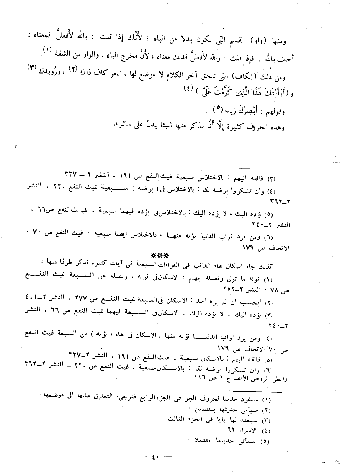 وَمِنْهَا (وَاو) الْقسم الَّتِي تكون بَدَلا من الباءِ لأَنَّك إِذا قلت بِاللَّه لأَفعلَّن فَمَعْنَاه أَحلف بِاللَّه فإِذا قلت وَالله لأَفعلّن فَذَلِك مَعْنَاهُ لأَنَّ مخرج الباءِ وَالْوَاو من الشّفة وَمن ذَلِك الْكَاف الَّتِي تلْحق آخر الْكَلَام لَا مَوضِع لَهَا نَحْو كَاف ذَاك وروُيدك و {أَرَأَيْنَكَ هَذّا الَّذِي كَرَّمْتَ عَلَيّ} وَقَوْلهمْ أَبْصِرْكَ زيدا وَهَذِه الْحُرُوف كَثِيرَة إِلاَّ أَنَّا نذْكر مِنْهَا شَيْئا يدلّ على سائرها