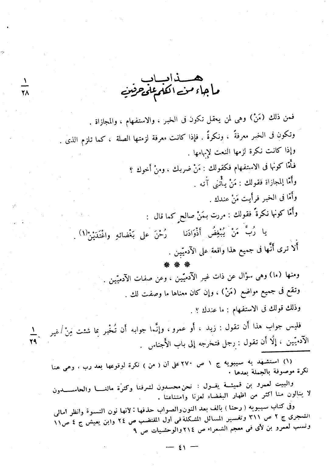 فَمن ذَلِك مَنْ وَهِي لمن يعقل تكون فِي الْخَبَر والاسنفهام والمجازاة وَتَكون فِي الْخَبَر معرفَة ونكرةً فإِذا كَانَت معرفَة لزمتها الصِّلَة كَمَا تلْزم الَّذِي وإِذا كَانَت نكرَة لَزِمَهَا النَّعْت لإبهامها فأَمّا كَونهَا فِي الإِستفهام فكقولك مَنْ ضربك ومنْ أَخوك وأَمَّا المجازاة فقولك مَنْ يأْتني آته وأَمَّا الْخَبَر فرأَيت مَنْ عنْدك وأَمَّا كَونهَا نكرَة فقولك مَرَرْت بمَنْ صالحٍ كَمَا قَالَ