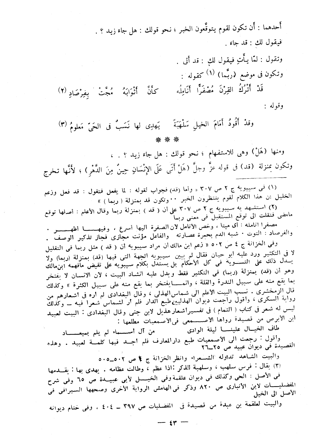 أَحدهما أَن تكون لقوم يتوقَّعون الْخَبَر نَحْو قَوْلك هَل جاءَ زيد فَيَقُول لَك قد جاءَ وَتقول لمّا يأَتِ فَيَقُول لَك قد أَتى وَتَكون فِي مَوضِع ربمَّا كَقَوْلِه