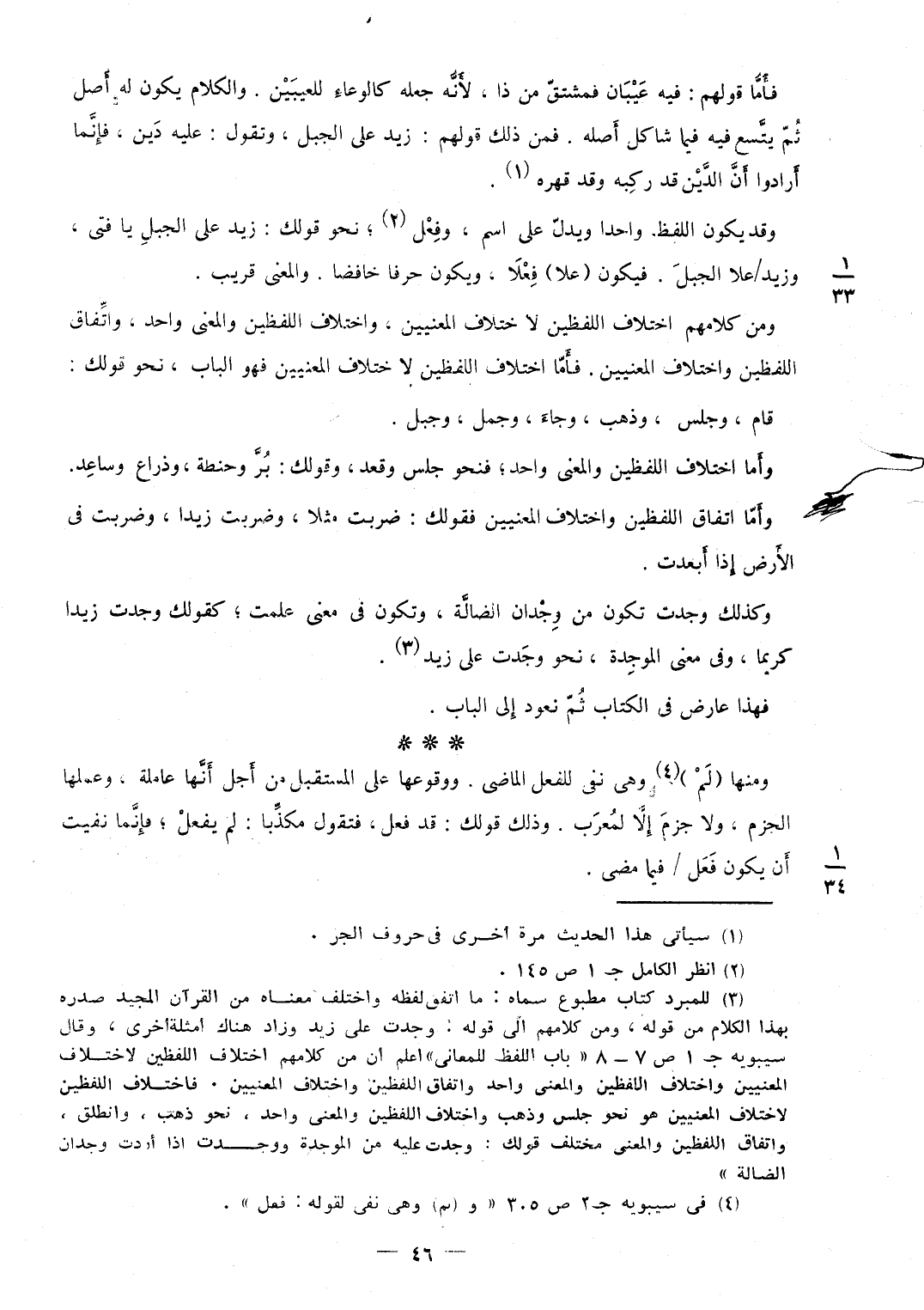 فأَمَّا قَوْلهم فِيهِ عَيْبَان فمشتقّ من ذَا لأَنَّه جعله كالوعاء للعيبَيْن وَالْكَلَام يكون لَهُ أَصل ثُمّ يتسَّع فِيهِ فِيمَا شاكل أَصله فَمن ذَلِك قَوْلهم زيد على الْجَبَل وَتقول عَلَيْهِ دَين فإِنَّما أَرادوا أَنَّ الدَّيْن قد ركِبه وَقد قهره وَقد يكون اللَّفْظ وَاحِدًا ويدلّ على اسْم وفِعْل نَحْو قَوْلك زيد على الجبلِ يَا فَتى وَزيد / علا الجبلَ فَيكون (علا) فِعْلاَ وَيكون حرفا خَافِضًا وَالْمعْنَى قريب وَمن كَلَامهم اخْتِلَاف اللَّفْظَيْنِ لاخْتِلَاف الْمَعْنيين وَاخْتِلَاف اللَّفْظَيْنِ وَالْمعْنَى وَاحِد واتِّفاق اللَّفْظَيْنِ وَاخْتِلَاف الْمَعْنيين فأَمَّا اخْتِلَاف اللَّفْظَيْنِ لاخْتِلَاف الْمَعْنيين فَهُوَ الْبَاب نَحْو قَوْلك قَامَ وَجلسَ وَذهب وجاءَ وجمل وجبل وأَما اخْتِلَاف اللَّفْظَيْنِ وَالْمعْنَى وَاحِد فنحو جلس وَقعد وقولك بُرَّ وحنطة وذراع وساعد وأَمَّا اتِّفَاق اللَّفْظَيْنِ وَاخْتِلَاف الْمَعْنيين فقولك ضربت مثلا وَضربت زيدا وَضربت فِي الأَرْض إِذا أَبعدت وَكَذَلِكَ وجدت تكون من وِجْدان الضالَّة وَتَكون فِي معنى علمت كَقَوْلِك وجدت زيدا كَرِيمًا وَفِي معنى الموجِدة نَحْو وجَدت على زيد فَهَذَا عَارض فِي الْكتاب ثُمّ نعود إِلَى الْبَاب وَمِنْهَا لَمْ وَهِي نفي للْفِعْل الْمَاضِي ووقوعها على الْمُسْتَقْبل من أَجل أَنَّها عاملة وعملها الْجَزْم وَلَا جزم إِلاَّ لمُعرَب وَذَلِكَ قَوْلك قد فعل فَتَقول مكذِّبا لم يفعلْ فإِنَّما نفيت أَن يكون فَعَل / فِيمَا مضى