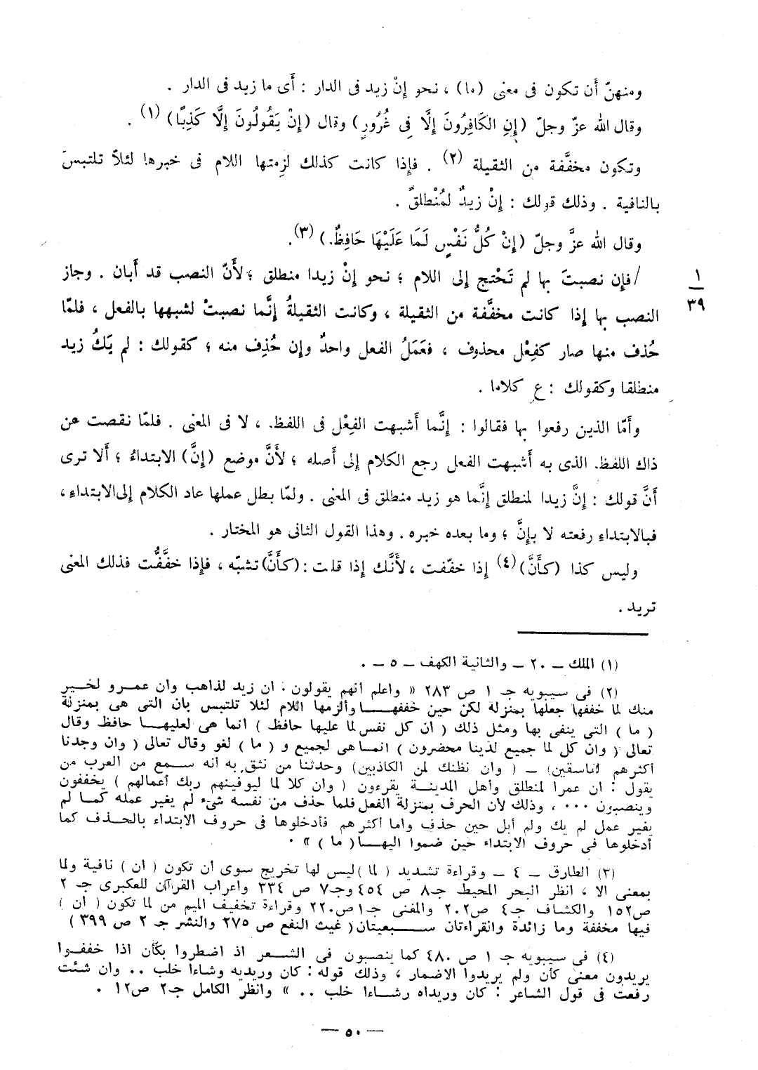 ومنهنّ أَن تكون فِي معنى مَا نَحْو إِنْ زيد فِي الدَّار أَي مَا زيد فِي الدَّار وَقَالَ الله عزَّ وجلَّ {إِن الْكَافِرُونَ إِلَّا فِي غرور} وَقَالَ {إِن يَقُولُونَ إِلَّا كذبا} وَتَكون مخفَّفة من الثَّقِيلَة فإِذا كَانَت كَذَلِك لزِمتها اللَّام فِي خَبَرهَا لئلاّ تلتبسَ بالنافية وَذَلِكَ قَوْلك إِنْ زيدٌ لمُنْطلقٌ وَقَالَ الله عزَّ وجلَّ {إِن كل نفس لما عَلَيْهَا حَافظ} / فإِن نصبتَ بهَا لم تَحْتَج إِلى اللَّام نَحْو أَنْ زيدا منطلق لأَنَّ النصب قد أَبان وَجَاز النصب بهَا إِذا كَانَت مخفَّفة من الثَّقِيلَة وَكَانَت الثَّقِيلَة إِنَّما نصبتْ لشبهها بِالْفِعْلِ فلمَّا حُذف مِنْهَا صَار كفِعْل مَحْذُوف فعَمَلُ الْفِعْل واحدٌ وإِن حُذِف مِنْهُ كَقَوْلِك لم يَكُ زيد مُنْطَلقًا وكقولك عِ كلَاما وأَمّا الَّذين رفعوا بهَا فَقَالُوا إِنّما أَشبهت الفِعْل فِي اللَّفْظ لَا فِي الْمَعْنى فلمّا نقصت عَن ذَاك اللَّفْظ الَّذِي بِهِ أَشبهت الْفِعْل رَجَعَ الْكَلَام إِلى أَصله لأَنَّ مَوضِع إِنَّ الابتداءُ أَلا ترى أَنَّ قَوْلك إِنَّ زيدا لمنطلق إِنَّما هُوَ زيد منطلق فِي الْمَعْنى ولمّا بَطل عَملهَا عَاد الْكَلَام إِلى الِابْتِدَاء فبالابتداء رفعته لَا بإِنَّ وَمَا بعده خَبره وَهَذَا القَوْل الثَّانِي هُوَ الْمُخْتَار وَلَيْسَ كَذَا كأَنَّ إِذا خفّفت لأَنَّك إِذا قلت كأَنَّ تشبّه فإِذا خفَّفُّت فَذَلِك الْمَعْنى تُرِيدُ