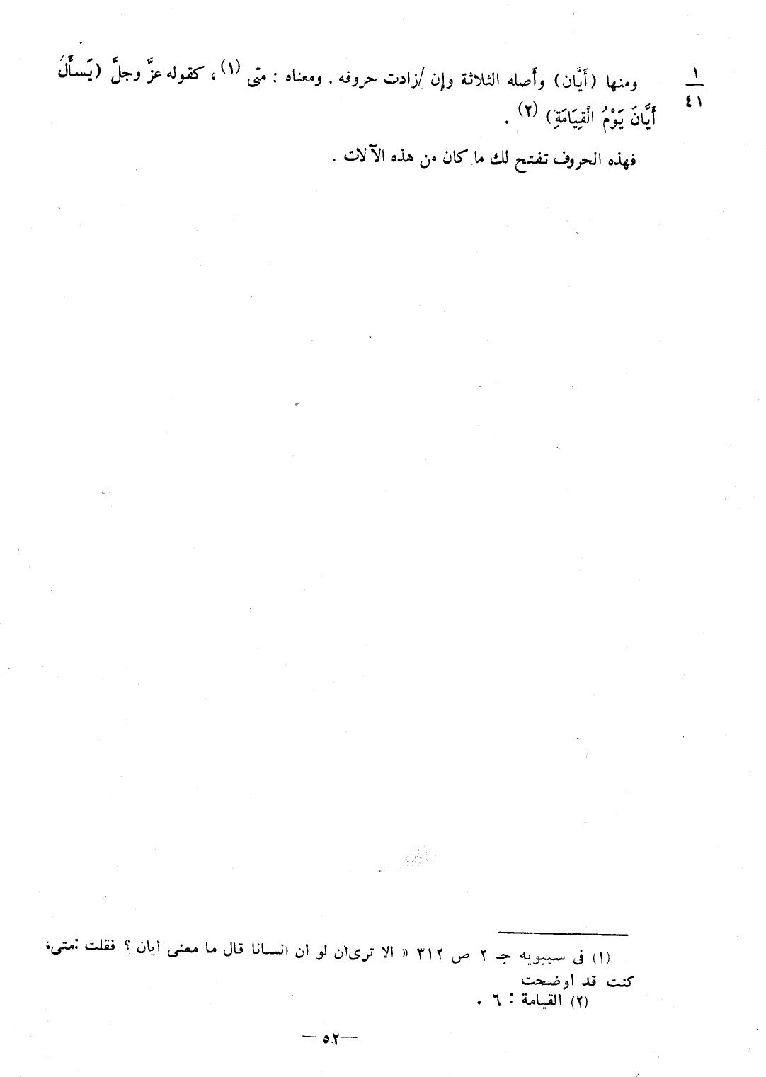 وَمِنْهَا أَيَّان وأَصله الثَّلَاثَة وإِن / زَادَت حُرُوفه وَمَعْنَاهُ مَتى كَقَوْلِه عزَّ وجلَّ {يسْأَل أَيَّانَ يَوْم الْقِيَامَة} فَهَذِهِ الْحُرُوف تفتح لَك مَا كَانَ من هَذِه الْآلَات