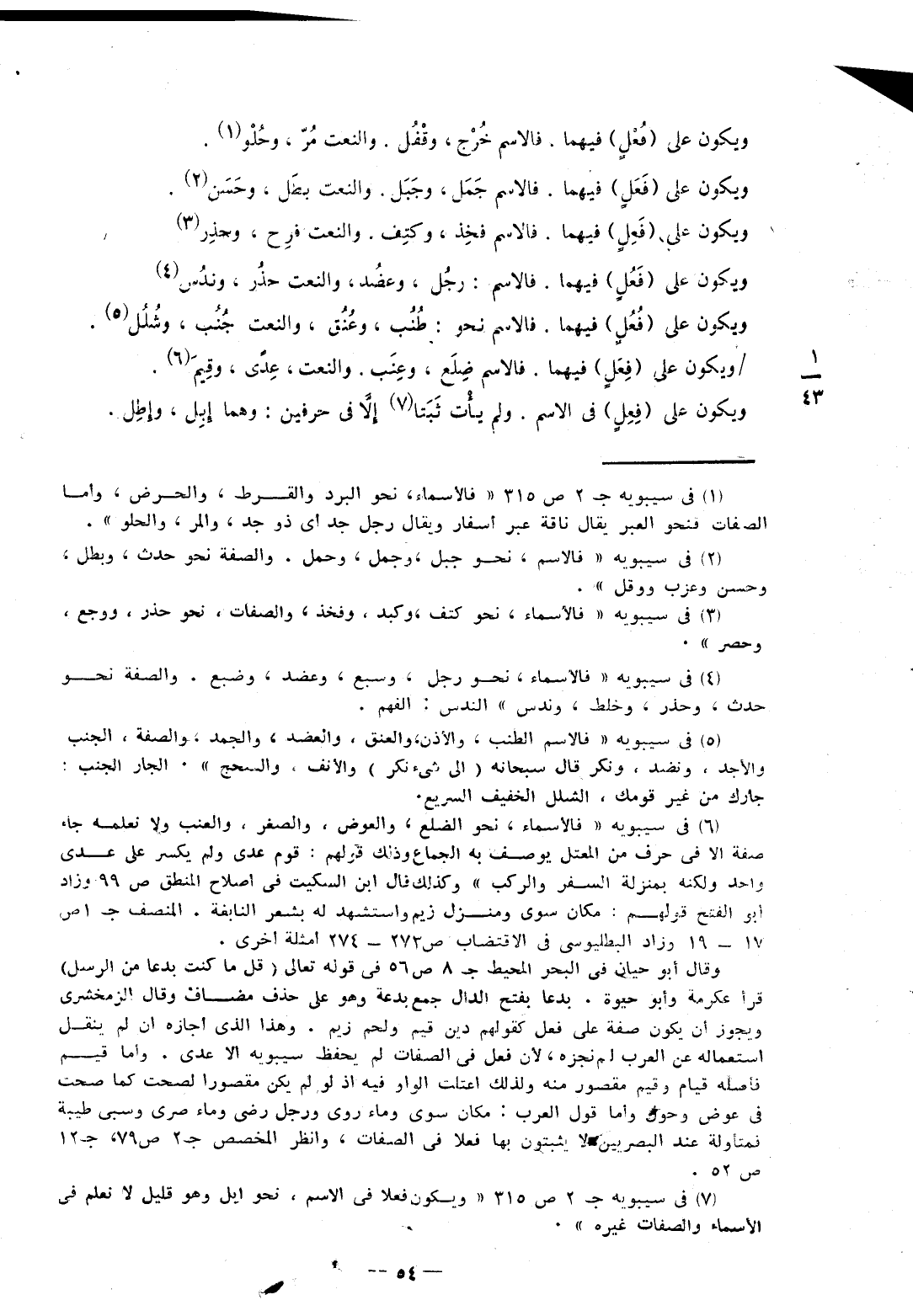 وَيكون على فُعْل فِيمَا فالاسم خُرْج وقْفُل والنعت مُرّ وحُلْو وَيكون على فَعَلٍ فيهمَا فالاسم جَمَل وجَبَل والنعت بطَل وحَسَن وَيكون على فَعِل فيهمَا فالاسم فَخِذ وكتِف والنعت فرِح وحذِر وَيكون على فَعُل فيهمَا فالاسم رجُل وعضُد والنعت حذُر وندُس وَيكون على فُعُل فيهمَا فالاسم نَحْو طُنُب وعُنُق والنعت جُنُب وشُلُل / وَيكون على فِعَل فيهمَا فالاسم ضِلَع وعِنَب والنعت عِدَّى وقِيَم وَيكون على فِعِلٍ فِي الِاسْم وَلم ياْت ثَبَتا إِلاّ فِي حرفين وهما إِبِل وإِطِل