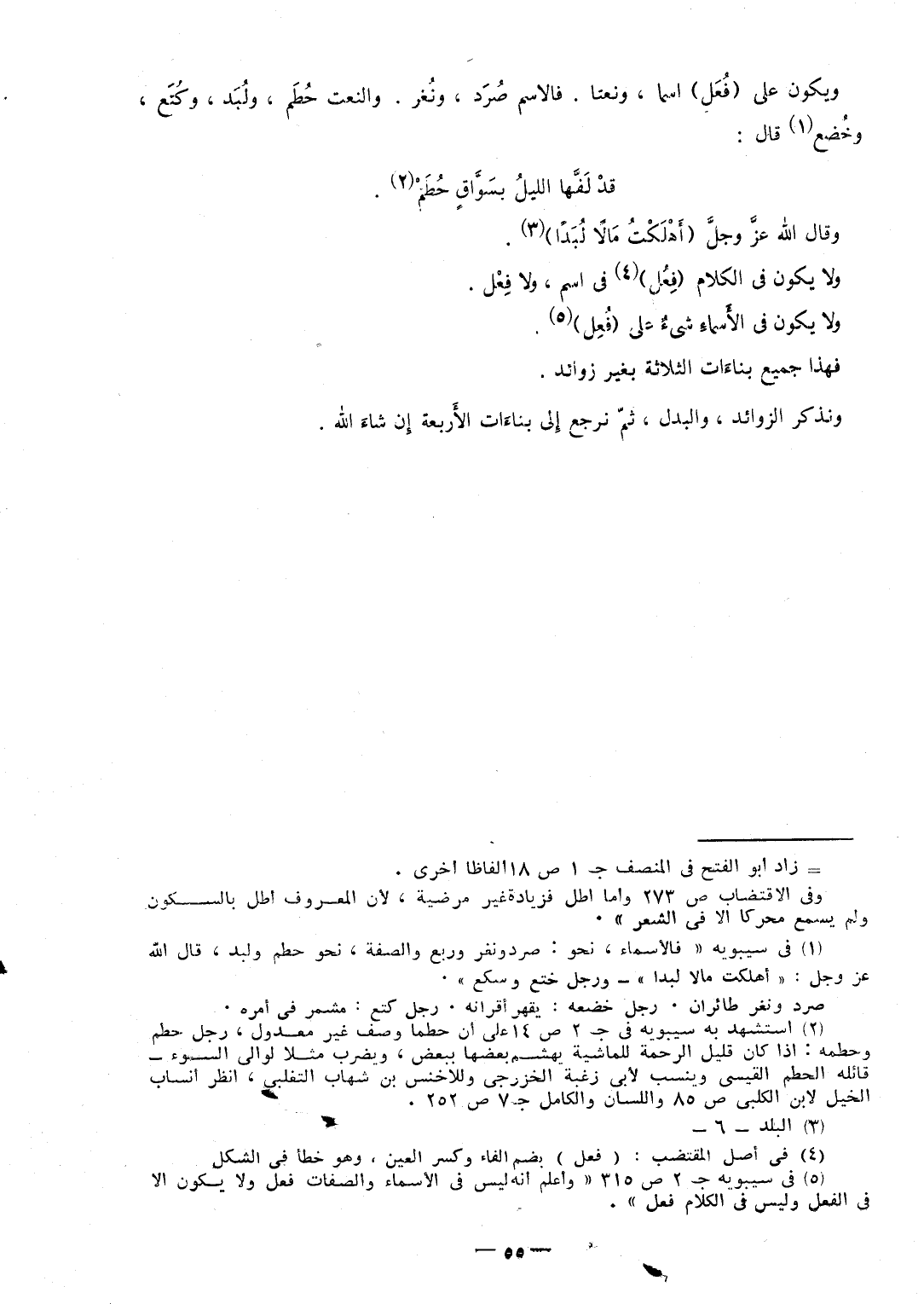 وَقَالَ الله عزَّ وجلَّ {أهلكت مَالا لبدا} وَلَا يكون فِي الْكَلَام فِعُل فِي اسْم وَلَا (فِعْل) وَلَا يكون فِي الأسماءِ شيءٌ على (فُعِل) فَهَذَا جَمِيع بناءات الثَّلَاثَة بِغَيْر زَوَائِد وَنَذْكُر الزَّوَائِد وَالْبدل ثمّ نرْجِع إِلى بناءَات الأَربعة إِن شَاءَ الله