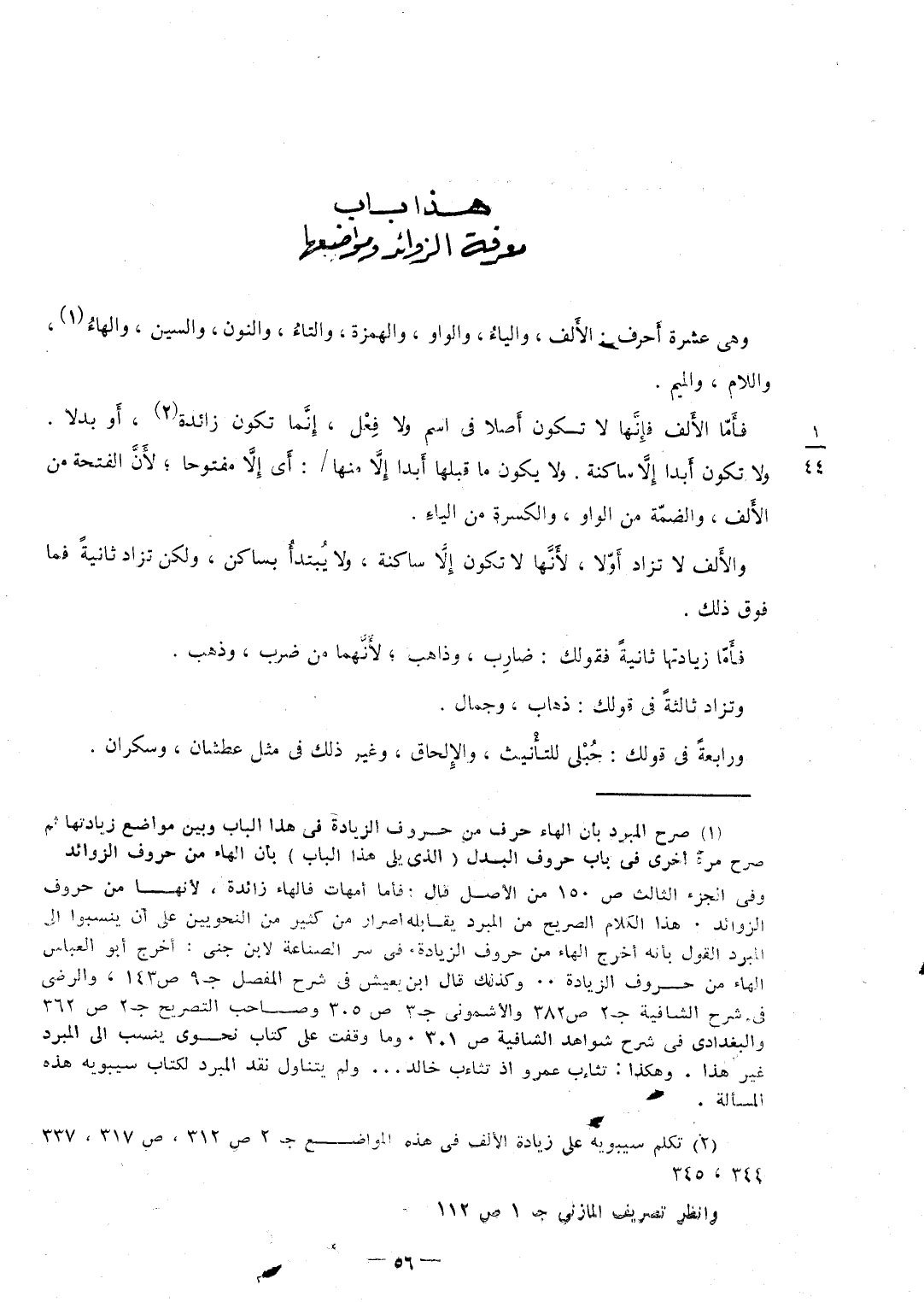 وَهِي عشرَة أَحرف الأَلف والياءُ وَالْوَاو والهمزة والتاءُ وَالنُّون وَالسِّين والهاءُ وَاللَّام وَالْمِيم فأَمَّا الأَلف فإِنَّها لَا تكون أَصلا فِي اسْم وَلَا فِعْل إِنَّما تكون زَائِدَة أَو بَدَلا وَلَا تكون أَبدا إِلاَّ سَاكِنة وَلَا يكون مَا قبلهَا أَبدا إِلاَّ مِنْهَا / أَي إِلاَّ مَفْتُوحًا لأَنَّ الفتحة من الأَلف والضمّة من الْوَاو والكسرة من الياءِ والأَلف لَا تُزاد أَوّلا لأَنَّها لَا تكون إِلاَّ سَاكِنة وَلَا يُبتدأُ بساكن وَلَكِن تزاد ثَانِيَة فَمَا فَوق ذَلِك فأَمَّا زيادتها ثانيةٌ فقولك ضارِب وذاهب لأَنَّهما من ضرب وَذهب وتزاد ثَالِثَة فِي قَوْلك ذهَاب وجمال ورابعة فِي قَوْلك حُبْلى للتأْنيث والإِلحاق وَغير ذَلِك فِي مثل عطشان وسكران