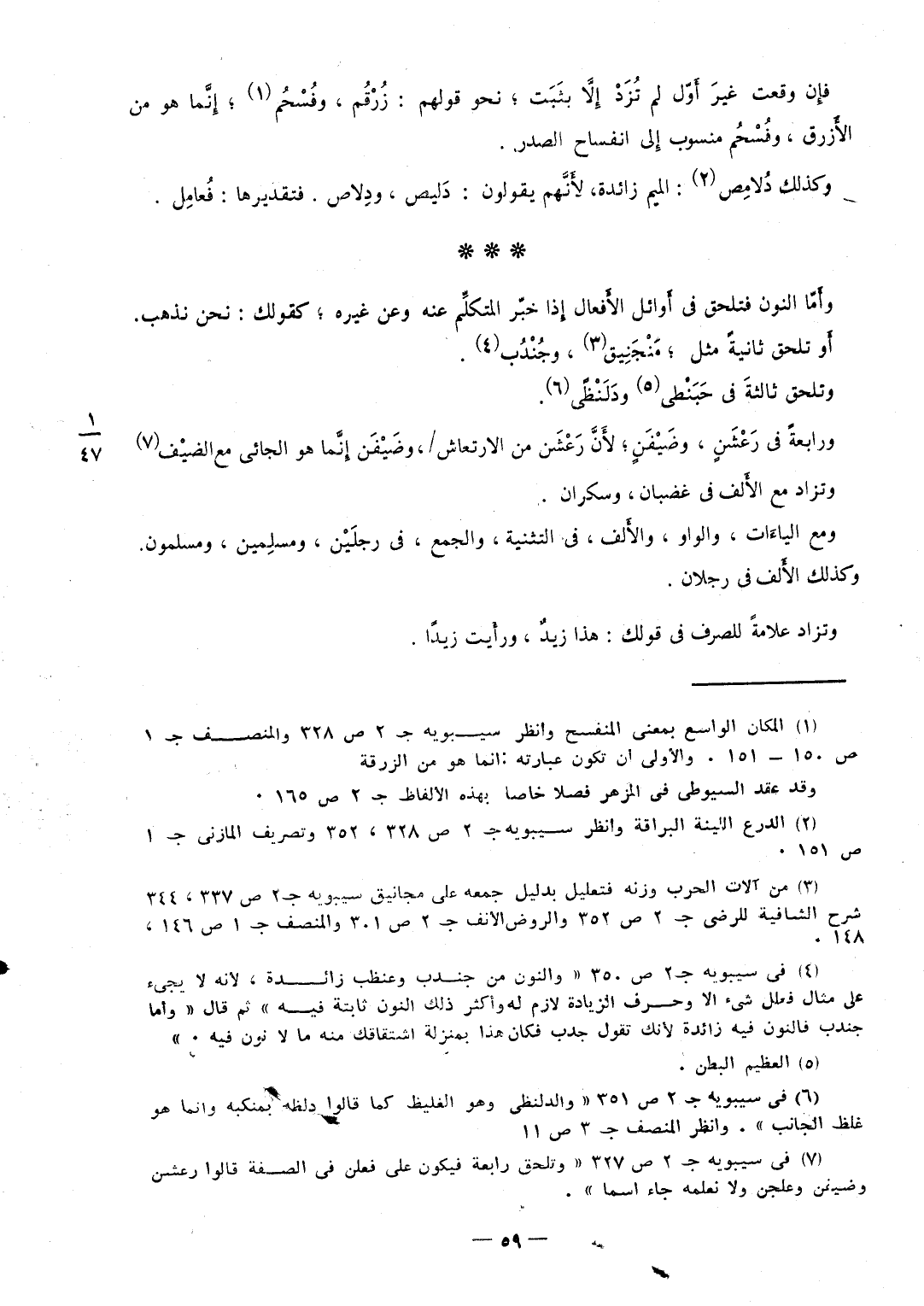 فإِن وَقعت غيرَ أَوّل لم تُزَدْ إِلاَّ بثَبَت نَحْو قَوْلهم زُرْقُم وفُسْحُم إِنَّما هُوَ من الأَزرق وفُسْحُم مَنْسُوب إِلى انفساح الصَّدْر وَكَذَلِكَ دُلامِص الْمِيم زَائِدَة لأَنَّهم يَقُولُونَ دَليص ودِلاص فتقديرها فُعامِل وأَمَّا النُّون فتلحق فِي أَوائل الأَفعال إِذا خبّر المتكلِّم عَنهُ وَعَن غَيره كَقَوْلِك نَحن نَذْهَب أَو تلْحق ثَانِيَة مثل مَنْجَنِيق وجُنْدُب وتلحق ثَالِثَة فِي حَنَبْطى ودَلَنْطىً ورابعة فِي رَعْشَنٍ وضَيْفَنٍ لأَنَّ رَعْشَن من الارتعاش / وضَيْفَن إِنَّما هُوَ الجائي مَعَ الضيْف وتزاد مَعَ الأَلف فِي غَضْبَان وسكران وَمَعَ الياءَات وَالْوَاو والأَلف فِي التَّثْنِيَة وَالْجمع فِي رجلَيْن ومسلِمين ومسلمون وَكَذَلِكَ الأَلف فِي رجلَانِ وتزاد عَلامَة للصرف فِي قَوْلك هَذَا زيدٌ ورأَيت زيدا