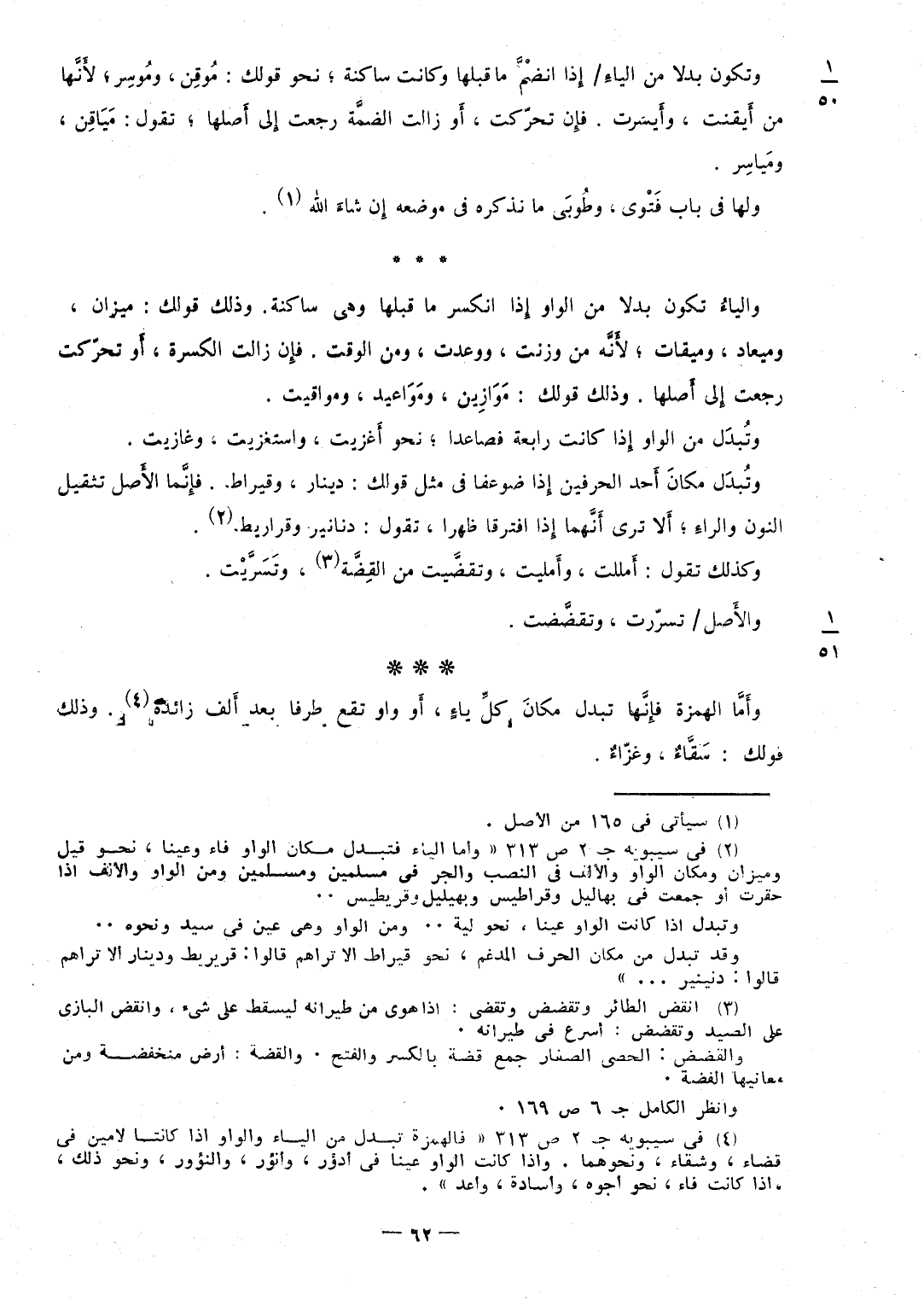 وَتَكون بَدَلا من الْيَاء / إِذا انضمَّ مَا قبلهَا وَكَانَت سَاكِنة نَحْو قَوْلك مُوقِن ومُوسِر لأَنَّها من أَيقنت وأَيسرت فإِن تحرّكت أَو زَالَت الضمَّة رجعت إِلى أَصلها تَقول مَيَاقِن ومَياسِر وَلها فى بَاب فَتْوى وطُوبَى مَا نذكرهُ فِي مَوْضِعه إِن شاءَ الله والياءُ تكون بَدَلا من الْوَاو إِذا انْكَسَرَ مَا قبلهَا وَهِي سَاكِنة وَذَلِكَ قَوْلك ميزَان وميعاد وميقات لأَنَّه من وزنت ووعدت وَمن الْوَقْت فإِن زَالَت الكسرة أَو تحرّكت رجعت إِلى أَصلها وَذَلِكَ قَوْلك مَوَازِين ومَوَاعيد ومواقيت وتُبدَل من الْوَاو إِذا كَانَت رَابِعَة فَصَاعِدا نَحْو أَغزيت واستغزيت وغازيت وتُبدَل مَكَان أَحد الحرفين إِذا ضوعفا فِي مثل قَوْلك دِينَار وقيراط فإِنَّما الأَصل تثقيل النُّون وَالرَّاء أَلا ترى أَنَّهما إِذا افْتَرقَا ظهرا تَقول دَنَانِير وقراريط وَكَذَلِكَ تَقول أَمللت وأَمليت وتقضَّيت من القِضَّة وتَسَرَّيْت والأَصل / تسررّت وتقضَّضت وأَمَّا الْهمزَة فإِنَّها تبدل مَكَان كلِّ ياءٍ أَو وَاو تقع طرفا بعد أَلف زَائِدَة وَذَلِكَ قَوْلك سَقَّاءٌ وغزّاءٌ