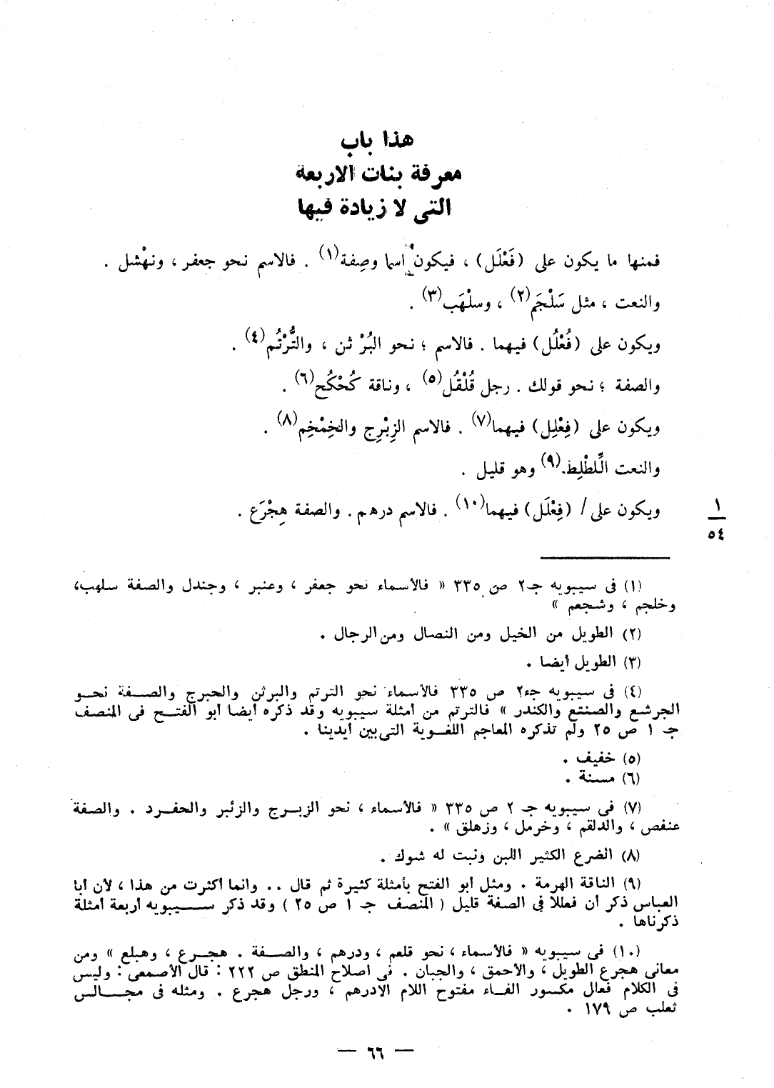 فَمِنْهَا مَا يكون على فَعْلَل فَيكون اسْما وصِفة فالاسم نَحْو جَعْفَر ونهْشل والنعت مثل سَلْجَم وسلْهَب وَيكون على فُعْلُل فيهمَا فالاسم نَحْو البُرْثن والتُّرْنُم وَالصّفة نَحْو قَوْلك رجل قُلْقُل وناقة كُحْكُح وَيكون على فِعْلِل فيهمَا فالاسم الزِبْرِج الخِمْخِم والنعت الِّطْلِط وَهُوَ قَلِيل وَيكون على (فِعْلَل) فيهمَا فالاسم دِرْهَم وَالصّفة هِجْرَع