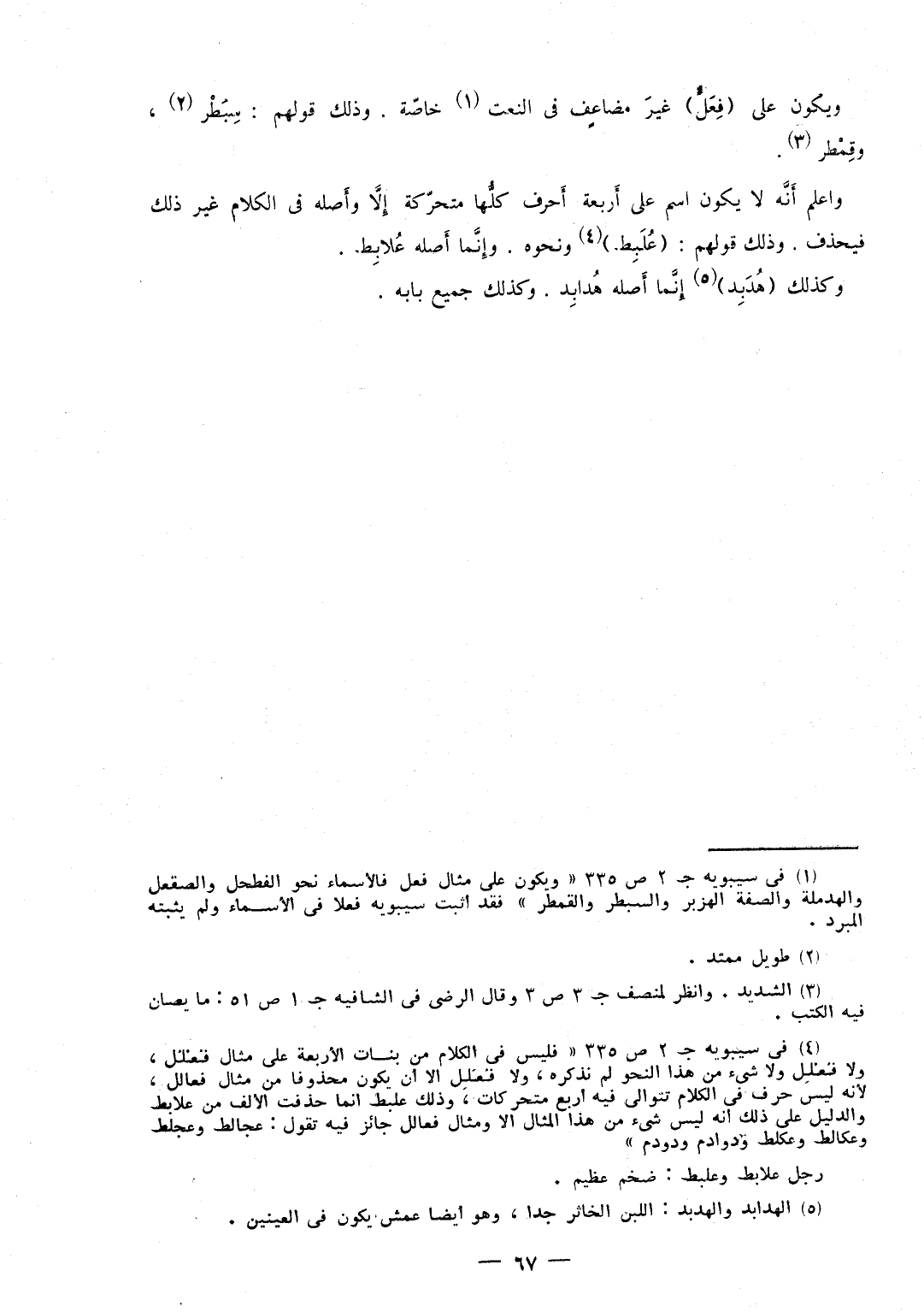 وَيكون على (فِعَلٍّ) غيرَ مضاعفٍ فِي النَّعْت خاصّة وَذَلِكَ قَوْلهم سِبَطْر وقِمْطر وَاعْلَم أَنَّه لَا يكون اسْم على أَربعة أَحرف كلُّها متحركة إِلاَّ وأَصله فِي الْكَلَام غير ذَلِك فيحذف وَذَلِكَ قَوْلهم (عُلَبِط) وَنَحْوه وإِنَّما أَصله عُلابِط وَكَذَلِكَ (هُدَبِد) إِنَّما أَصله هُدابِد وَكَذَلِكَ جَمِيع بَابه
