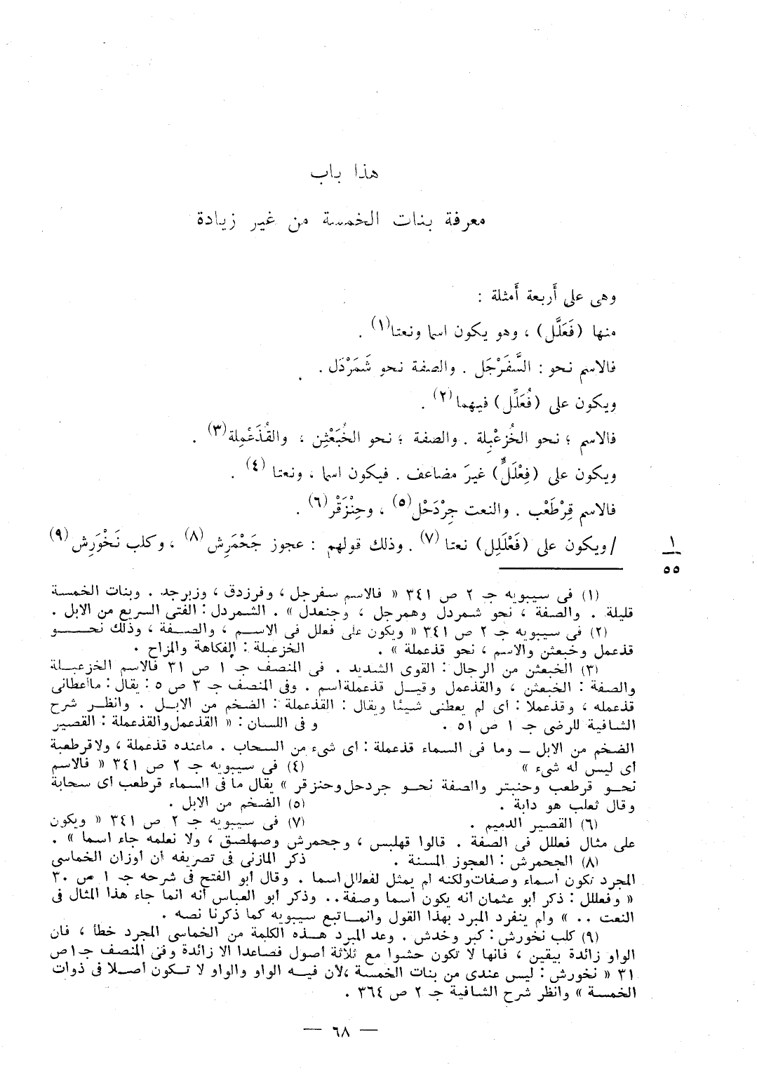 وَهِي على أَربعة أَمثلة مِنْهَا فَعَلَّل وَهُوَ يكون اسْما ونعتا فالاسم نَحْو السَّفَرْجَل وَالصّفة نَحْو شَمَرْدَل وَيكون على فُعَلَّل فيهمَا فالاسم نَحْو الخُزعْبِلة وَالصّفة نَحْو الخُبَعْثِن والقُذَعْمِلة وَيكون على فِعْلَلٍّ غير مضاعف فَيكون اسْما ونعتا فالاسم قِرْطَعْب والنعت جِرْدَحْل وحِنْزَقْر / وَيكون على فَعْلَلِل نعتا وَذَلِكَ قَوْلهم عَجُوز جَحْمَرِش وكلب نَخْوَرِش