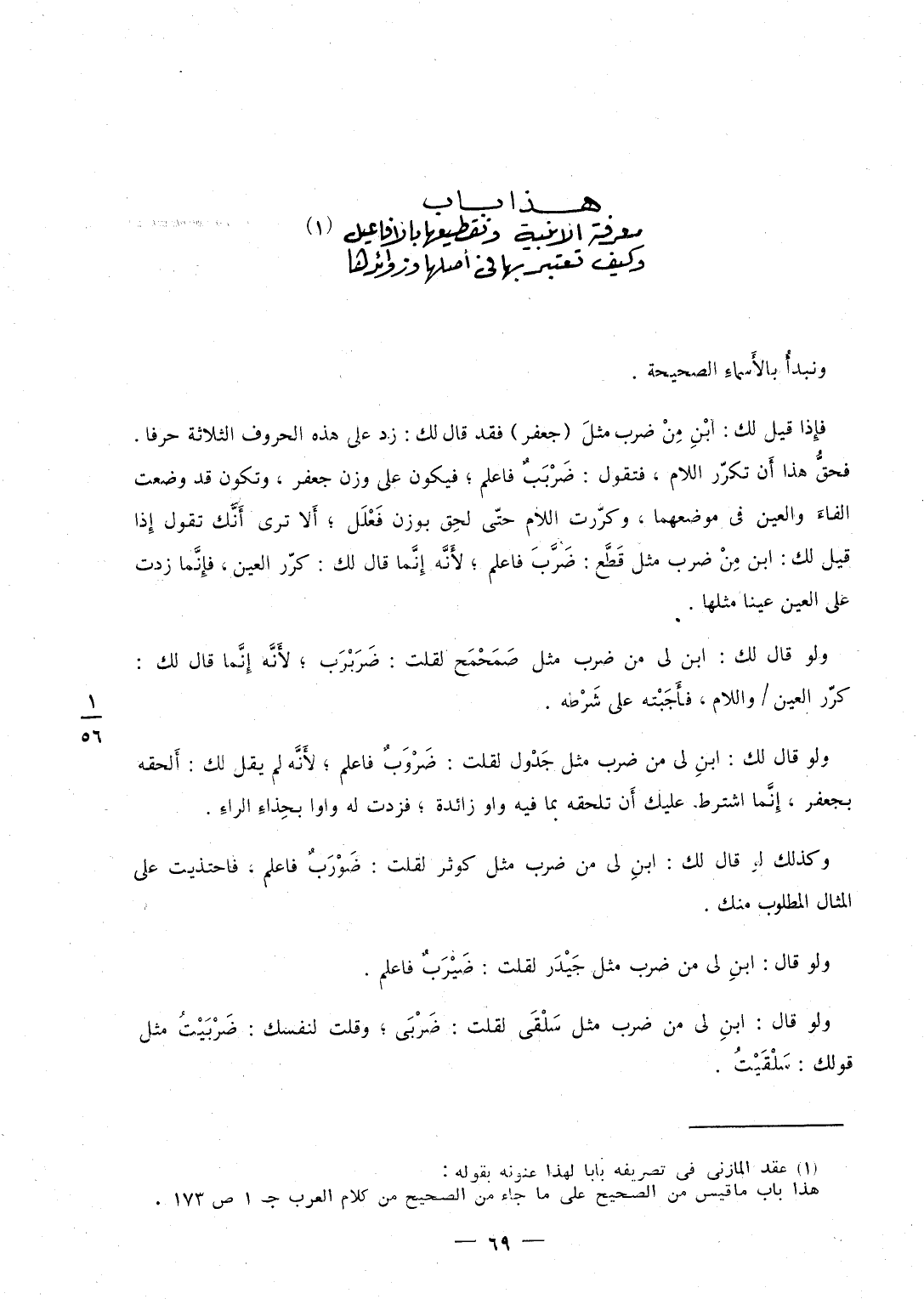 ونبدأُ بالأَسماءِ الصَّحِيحَة فإِذا قيل لَك ابْنِ مِنْ ضرب مثلَ جَعْفَر فقد قَالَ لَك زد على هَذِه الْحُرُوف الثَّلَاثَة حرفا فحقُّ هَذَا أَن تكرّر اللَّام فَتَقول ضَرْبَبٌ فَاعْلَم فَيكون على وزن جَعْفَر وَتَكون قد وضعت الفاءَ وَالْعين فِي موضعهما وكرّرت اللَّام حتّى لحِق بِوَزْن فَعْلَل أَلا ترى أَنَّك تَقول إِذا قيل لَك ابْن مِنْ ضرب مثل قَطَّع ضَرَّبَ فَاعْلَم لأَنَّه إِنَّما قَالَ لَك كرّر الْعين فإِنَّما زِدْت على الْعين عينا مثلهَا وَلَو قَالَ لَك ابْن لي من ضرب مثل صَمَحْمَح لَقلت ضَرَبْرَب لأَنَّه إِنَّما قَالَ لَك كرّر الْعين / وَاللَّام فأَجَبْته على شَرْطه وَلَو قَالَ لَك ابْن لي من ضرب مثل جَدْول لَقلت ضَرْوَبٌ فَاعْلَم لأَنَّه لم يقل لَك أَلحقه بِجَعْفَر إِنَّما اشْترط عَلَيْك أَن تلْحقهُ بِمَا فِيهِ وَاو زَائِدَة فزدت لَهُ واوا بحِذاءِ الراءِ وَكَذَلِكَ لَو قَالَ لَك ابنِ لي من ضرب مثل كوثر لَقلت ضَوْرَبٌ فَاعْلَم فاحتذيت على الْمِثَال الْمَطْلُوب مِنْك وَلَو قَالَ ابنِ لي من ضرب مثل جَيْدَر لَقلت ضَيْرَبٌ فَاعْلَم وَلَو قَالَ ابنِ لي من ضرب مثل سَلْقَى لَقلت ضَرْبَى وَقلت لنَفسك ضَرْبَيْتُ مثل قَوْلك سَلْقَيْتُ