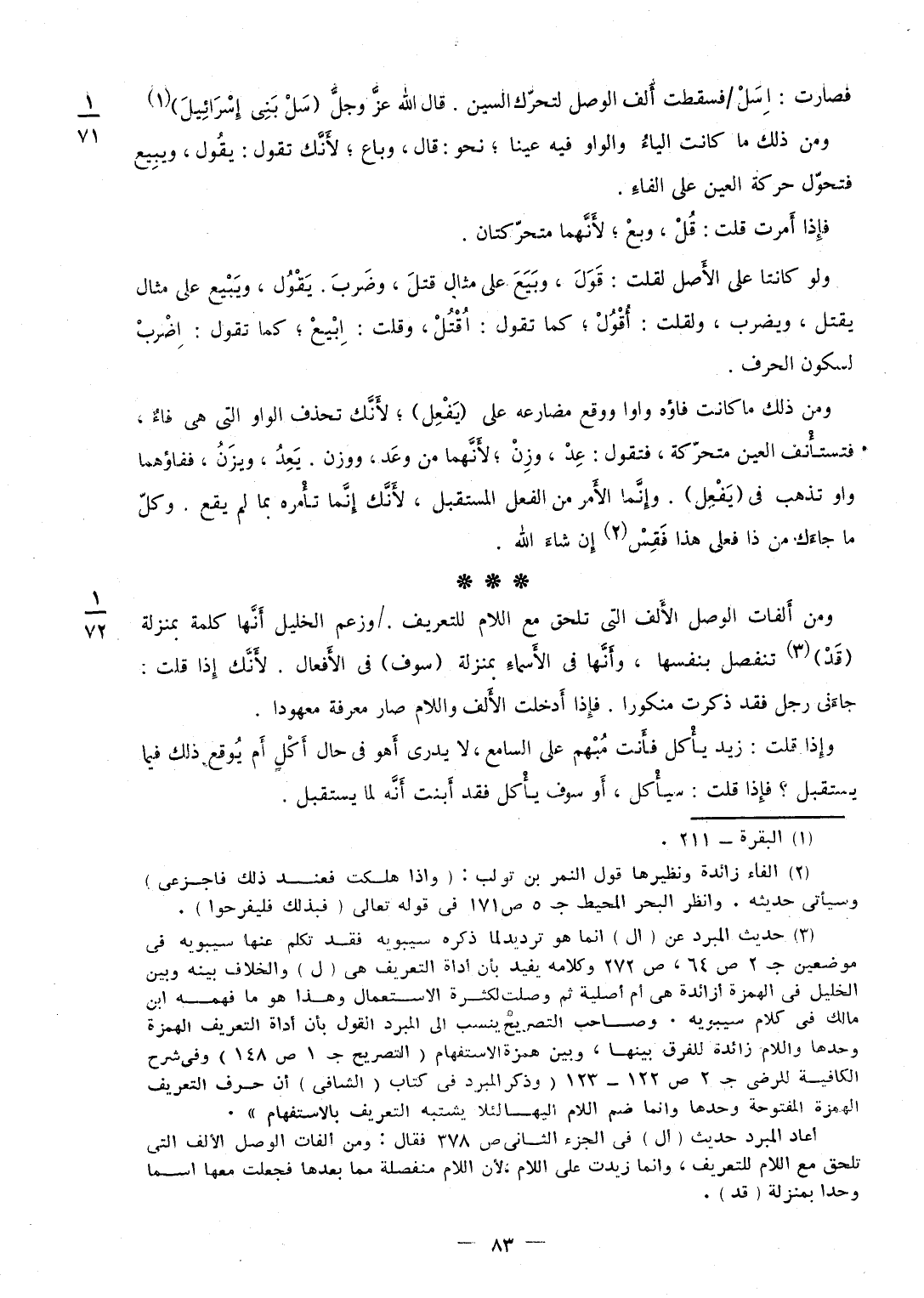 فَصَارَت اِسَلْ / فَسَقَطت أَلف الْوَصْل لتحرّك السِّين قَالَ الله عزَّ وجلَّ {سل بني إِسْرَائِيل} وَمن ذَلِك مَا كَانَت الياءُ وَالْوَاو فِيهِ عينا نَحْو قَالَ وَبَاعَ لأَنَّك تَقول يقُول ويبيِع فتحوّل حَرَكَة الْعين على الفاءِ فإِذا أَمرت قلت قُلْ وبعْ لأَنَّهما متحرّكان وَلَو كَانَتَا على الأَصل لَقلت قَوَلَ وبَيَعَ على مِثَال قتلَ وضَربَ يَقْوُل ويَبْيع على مِثَال يقتل وَيضْرب ولقلت أُقْوُلْ كَمَا تَقول اُقْتُلْ وَقلت اِبْيعْ كَمَا تَقول اِضْربْ لسكون الْحَرْف وَمن ذَلِك مَا كَانَت فاؤه واوا وَوَقع مضارعه على يَفْعِل لأَنَّك تحذف الْوَاو الَّتِي هِيَ فاءٌ فتستأْنف الْعين متحركة فَتَقول عِدْ وزِنْ لأَنَّهما من وعَد وَوزن يَعِدُ ويزَنُ ففاؤهما وَاو تذْهب فِي يَفْعِل وإِنَّما الأَمر من الْفِعْل الْمُسْتَقْبل لأَنَّك إِنَّما تأْمره بِمَا لم يَقع وكلّ مَا جاءَك من ذَا فعلى هَذَا فَقِسْ إِن شاءَ الله وَمن أَلفات الْوَصْل الأَلف الَّتِي تلْحق مَعَ اللَّام للتعريف / وَزعم الْخَلِيل أَنَّها كلمة بِمَنْزِلَة قَدْ تنفصل بِنَفسِهَا وأَنَّها فِي الأَسماءِ بِمَنْزِلَة سَوف فِي الأَفعال لأَنَّك إِذا قلت جاءَني رجل فقد ذكرت منكورا فإِذا أَدخلت الأَلف وَاللَّام صَار معرفَة معهودا وإِذا قلت زيد يأْكل فأَنت مُبْهم على السَّامع لَا يدْرِي أَهو فِي حَال أَكْلِ أَم يُوقع ذَلِك فِيمَا يسْتَقْبل فإِذا قلت سيأْكل أَو سَوف يأْكل فقد أَبنت أَنَّه لما يسْتَقْبل