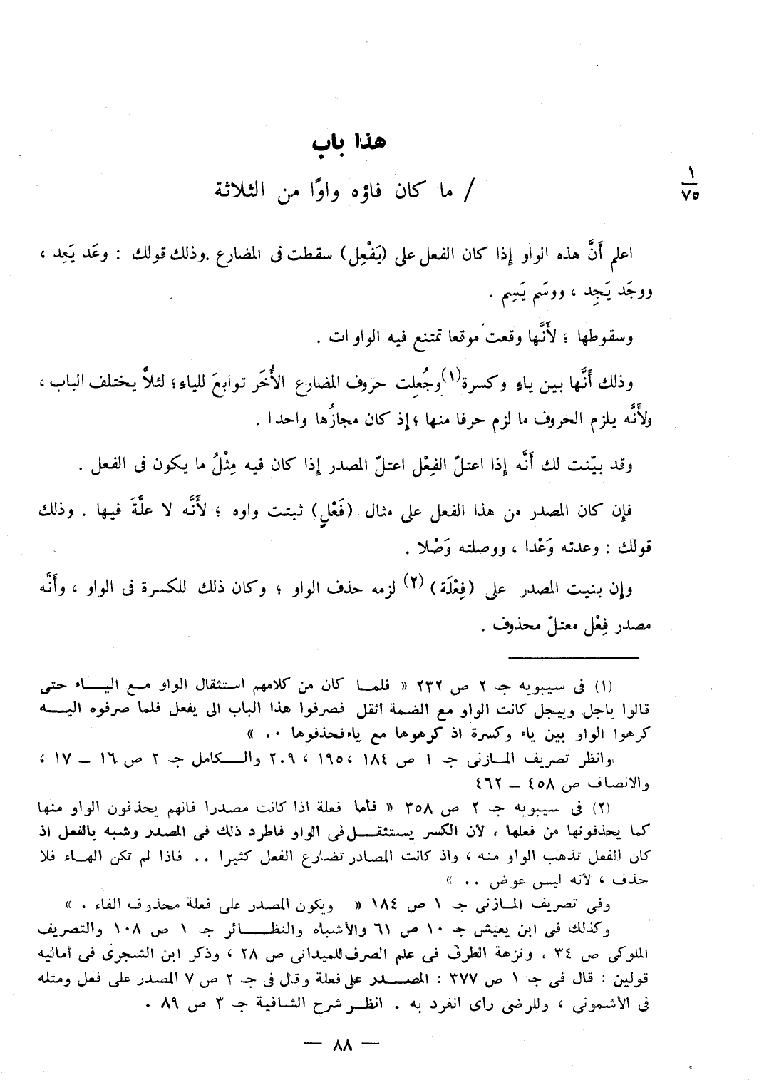 اعْلَم أَنَّ هَذِه الْوَاو إِذا كَانَ الْفِعْل على (يَفْعِل) سَقَطت فِي الْمُضَارع وَذَلِكَ قَوْلك وعَد يَعِد ووجَد يَجِد ووسَم يَسِم وسقوطها لأَنَّها وَقعت موقعا تمْتَنع فِيهِ الواوات وَذَلِكَ أَنَّها بَين ياءٍ وكسرة وجُعِلت حُرُوف الْمُضَارع الأُخَر توابعَ للياءِ لئلاَّ يخْتَلف الْبَاب ولأَنَّه يلْزم الْحُرُوف مَا لزم حرفا مِنْهَا إِذْ كَانَ مجازُها وَاحِدًا وَقد بينّت لَك أَنَّه إِذا اعتلّ الفِعْل اعتلّ الْمصدر إِذا كَانَ فِيهِ مِثْلُ مَا يكون فِي الْفِعْل فإِن كَانَ الْمصدر من هَذَا الْفِعْل على مِثَال فَعْلٍ ثبتَتْ واوه لأَنَّه لَا علَّة فِيهَا وَذَلِكَ قَوْلك وعدته وَعْدا ووصلته وَصْلا وإِن بنيت الْمصدر على فِعْلَة لزمَه حذف الْوَاو وَكَانَ ذَلِك للكسرة فِي الْوَاو وأنَّه مصدر فِعْل معتلّ مَحْذُوف