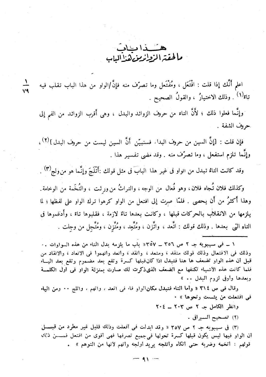 اعْلَم أَنَّك إِذا قلت افْتَعَل ومُفْتَعل وَمَا تصرّف مِنْهُ فإِن / الْوَاو من هَذَا الْبَاب تقلب فِيهِ تَاء وَذَلِكَ الِاخْتِيَار والقولُ الصَّحِيح وإِنَّما فعلوا ذَلِك لأَنَّ التاءَ من حُرُوف الزَّوَائِد وَالْبدل وَهِي أَقرب الزَّوَائِد من الْفَم إِلى حُرُوف الشّفة فإِن قلت إِنَّ السِّين من حُرُوف الْبَدَل فسنبين أَنَّ السِّين لَيست من حُرُوف الْبَدَل وإِنَّما تلْزم استفعل وَمَا تصرّف مِنْهُ وَقد مضى تَفْسِير هَذَا وَقد كَانَت التاءُ تبدل من الْوَاو فِي غير هَذَا الْبَاب فِي قَوْلك أَتْلَجَ وإِنَّما هُوَ من ولج وَكَذَلِكَ فلَان تُجاه فلَان وَهُوَ فُعال من الْوَجْه والتراثُ من ورِثت والتُخَمة من الوخامة وَهَذَا أَكثر من أَن يُحْصى فلمّا صرت إِلى افتعل من الْوَاو كَرهُوا ترك الْوَاو على لَفظهَا لما يلْزمهَا من الانقلاب بالحركات قبلهَا وَكَانَت بعْدهَا تاءٌ لَازِمَة فقلبوها تَاء وأَدغموها فِي التاءِ الَّتِي بعْدهَا وَذَلِكَ قَوْلك اتَّعد واتَّزن ومُتَّعِد ومُتَّزِن ومُتَّجِل من وجِلت