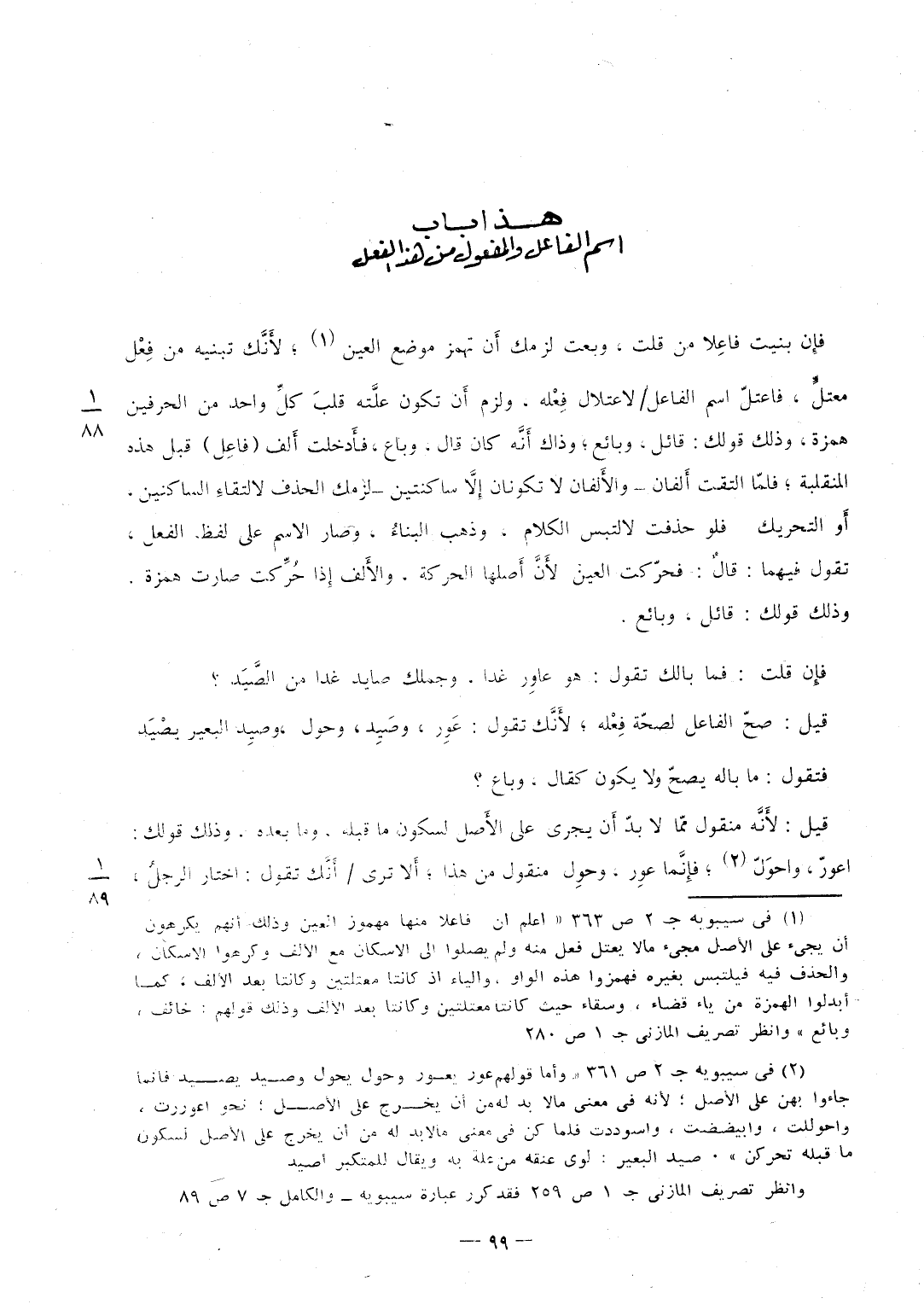 فإِن بنيت فاعِلا من قلت وبعت لزمك أَن تهمز مَوضِع الْعين لأَنَّك تبنيه من فِعْل معتلٍّ فاعتلّ اسْم الْفَاعِل / لاعتلال فِعْله وَلزِمَ أَن تكون علَّته قلبَ كلِّ وَاحِد من الحرفين همزَة وَذَلِكَ قَوْلك قَائِل وبائع وَذَاكَ أَنَّه كَانَ قَالَ وَبَاعَ فأَدخلت أَلف فاعِل قبل هَذِه المنقلبة فلمّا الْتَقت أَلفان والأَلفان لَا تَكُونَانِ إِلاَّ ساكنتين لزمك الْحَذف لالتقاء الساكنين أَو التحريك فَلَو حذفت لالتبس الْكَلَام وَذهب البناءُ وَصَارَ الِاسْم على لفظ الْفِعْل تَقول فيهمَا قالٌ فحرّكت الْعين لأَنَّ أَصلها الْحَرَكَة والأَلف إِذا حُرِّكت صَارَت همزَة وَذَلِكَ قَوْلك قَائِل وبائع فإِن قلت فَمَا بالك تَقول هُوَ عاوِر غَدا وجملك صايد غَدا من الصَّيَد قيل صحّ الْفَاعِل لصحّة فِعْله لأَنَّك تَقول عَوِر وصَيِد وحول وصيِد الْبَعِير يصْيَد فَتَقول مَا باله يصحّ وَلَا يكون كقال وَبَاعَ قيل لأَنَّه مَنْقُول ممّا لابدّ أَن يجْرِي على الأَصل لسكون مَا قبله وَمَا بعده وَذَلِكَ قَوْلك اعورّ واحوَلّ فإِنَّما عوِر وحوِل مَنْقُول من هَذَا أَلا ترى / أَنَّك تَقول اخْتَار الرجلُ