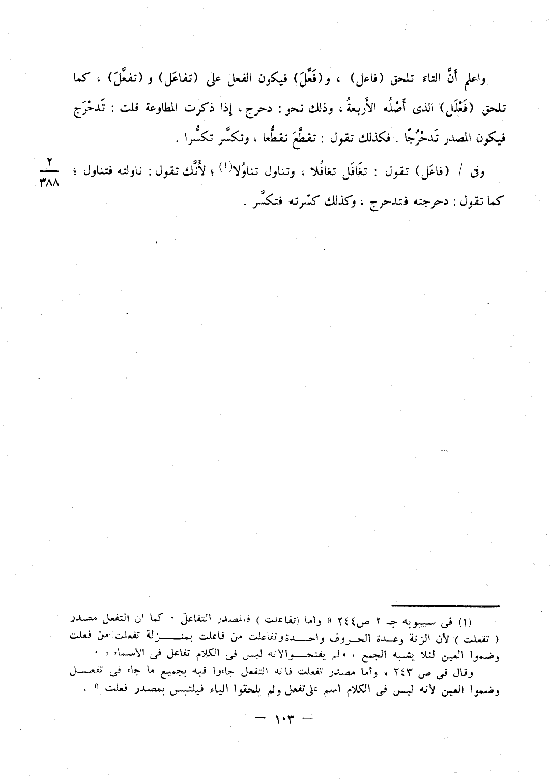 فمثال بَنَات الْأَرْبَعَة الَّتِي لَا زِيَادَة فِيهَا فعلل وَذَلِكَ نَحْو دحرج وهملج وسرهف وَقد مضى قَوْلنَا فِي مصدره وتلحق بِهِ الثَّلَاثَة بِالْوَاو ثَانِيَة فَيكون على فوعل وَذَلِكَ نَحْو حوقل كَمَا تلْحق اسْما نَحْو كوثر وجورب والمصدر كالمصدر وتلحق الْوَاو ثَالِثَة فَيكون على فعول نَحْو جهورة كَلَامه جهور كَمَا يلْحقهُ اسْما وَذَلِكَ قَوْلك جدول والمصدر كالمصدر وتلحقه الْيَاء ثَانِيَة فَيكون الْفِعْل على فيعل وَذَلِكَ نَحْو بيطر كَمَا يلْحقهُ اسْما إِذا قلت رجل جيدر وصيرف والمصدر كالمصدر تَقول بيطر بيطرة وتلحقه الْيَاء رَابِعَة نَحْو سلقى وجعبى والمصدر كالمصدر وَنَظِيره من الْأَسْمَاء أرطى وعلقى ويدلك على أَن الْألف لَيست للتأنيث أَنَّك تَقول فِي الْوَاحِدَة أَرْطَاة وعلقاة وَهَذَا مُبين فِي بَاب التصريف وَإِنَّمَا نذْكر هَا هُنَا شَيْئا للباب الَّذِي ذَكرْنَاهُ وكل مَا كَانَ مُلْحقًا بِشَيْء من الْفِعْل فمصدره كمصدره وَلَيْسَ فِي الْأَفْعَال شَيْء على فعيل وَلَكِن فعيل مُلْحق بهجرع وَذَلِكَ هريع وحيثل فالفعل من بَنَات الْأَرْبَعَة بِغَيْر زِيَادَة لَا يكون إِلَّا على فعلل فالأسماء تكون على فعلل