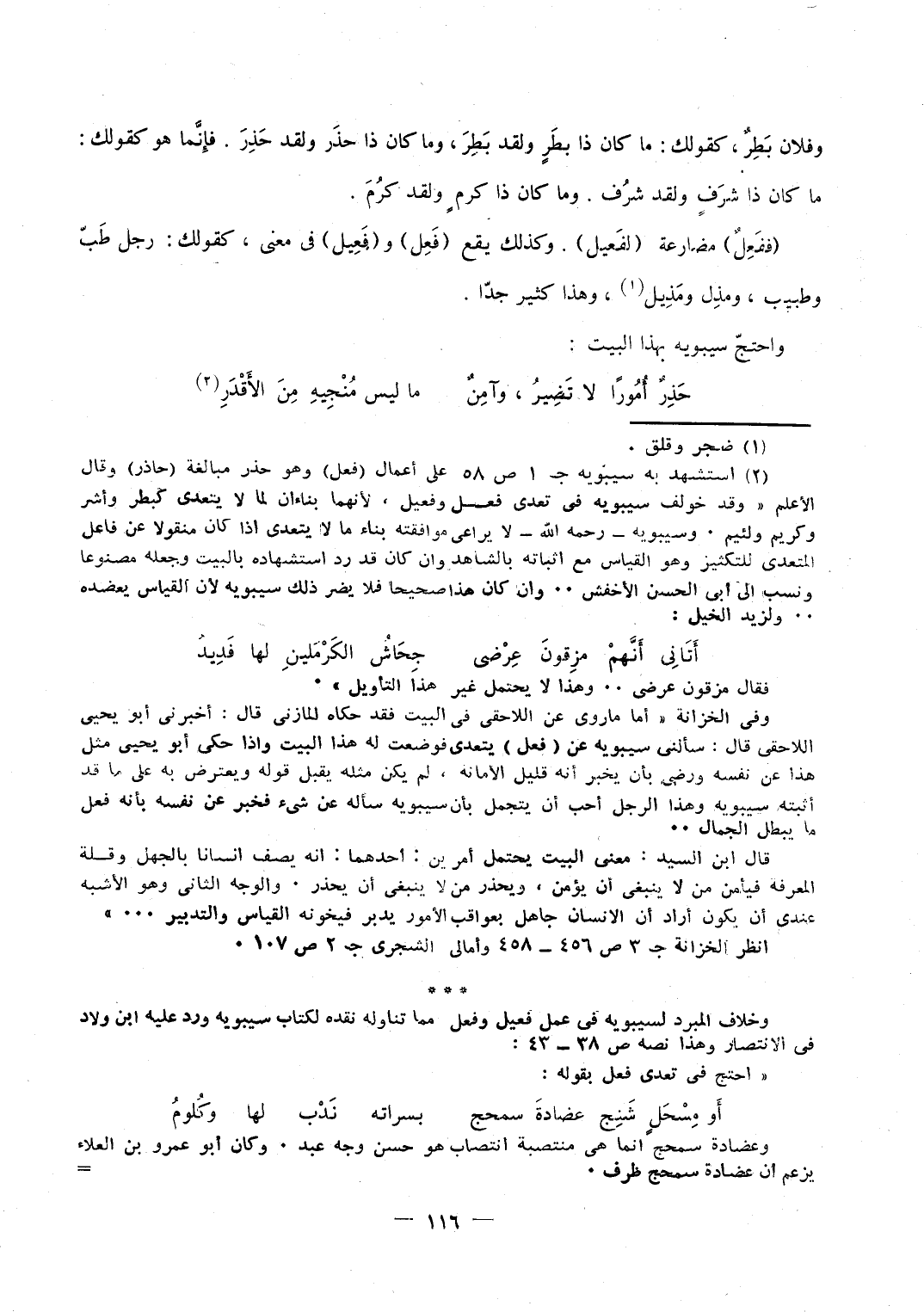 وَكَذَلِكَ إِن بنيت من الْفِعْل اسْما لمَكَان أَو زمَان كَانَ كل وَاحِد مِنْهُمَا على مِثَال الْمَفْعُول لِأَن الزَّمَان وَالْمَكَان مفعول فيهمَا وَذَلِكَ قَوْلك فِي المصادر أدخلته مدخلًا كَمَا قَالَ عز وَجل {أنزلني منزلا مُبَارَكًا} و {باسمِ اللهِ مُجْريهَا ومُرْسَاها} وَكَذَلِكَ سرحته مسرحا وَهَذَا مسرحنا أَي فِي مَوضِع تسريحنا وَهَذَا مقامنا لِأَنَّك تُرِيدُ بِهِ الْمصدر وَالْمَكَان من أَقمت وعَلى ذَلِك قَالَ الله عز وَجل {إِنَّهَا ساءت مُسْتَقرًّا ومقاما} لِأَنَّهَا من أَقمت وَقَالَ {يَا أهْلَ يَثْرِبَ لَا مَقَام لنَا} لِأَنَّهَا من قُمْت مَوضِع قيام وَمن قَرَأَ {لَا مقَام} إِنَّمَا يُرِيد لَا إِقَامَة