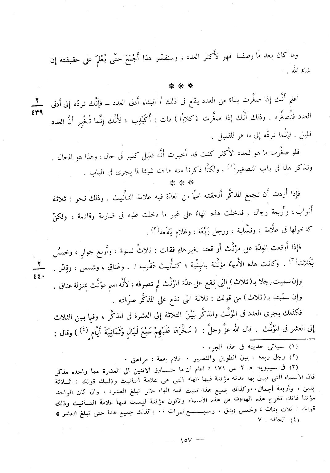 وَتقول عِنْدِي ثَلَاثَة محمدين وَخَمْسَة جعفرين لِأَن هَذَا مِمَّا يجمع بِالْوَاو وَالنُّون فَإِن قلت محامد وجعافر على أَنَّك أردْت ثَلَاثَة من الجعافر وَثَلَاثَة من المحامد كَانَ جيدا على مَا فسرت لَك فَإِذا خرجت عَن العقد الأول ضممت إِلَيْهِ اسْما مِمَّا كَانَ فِي أصل الْعدَد إِلَى أَن تتسعه وَذَلِكَ قَوْلك عِنْدِي أحد عشر رجلا وَخَمْسَة عشر رجلا بنيت أحد مَعَ عشر وغيرت اللَّفْظ للْبِنَاء وَذَلِكَ أَنَّك جعلتهما اسْما وَاحِدًا وَكَانَ الأَصْل أحدا وَعشرَة وَخَمْسَة وَعشرَة فَلَمَّا كَانَ أصل الْعدَد أَن يكون اسْما وَاحِد يدل على جَمِيع نَحْو ثَلَاثَة وَأَرْبَعَة وَخَمْسَة بنوا هذَيْن الاسمين فجعلوهما اسْما وَاحِد ألزموهما الْفَتْح لِأَنَّهُ أخف الحركات كَمَا قَالُوا هُوَ جاري بَيت بَيت ولقيته كفة كفة يَا فَتى الْقَوْم فِيهَا شغر بغر