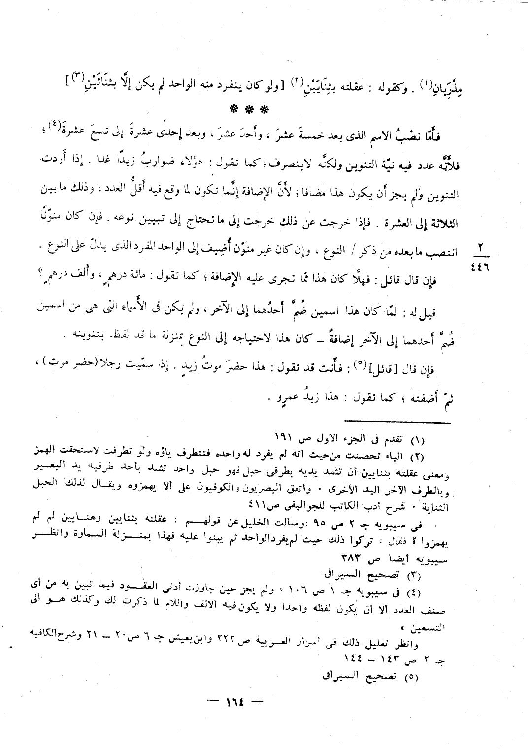 وَلم يجز أَن تَقول عشرُون الدِّرْهَم لِأَن درهما بعد عشْرين تَمْيِيز مُنْفَصِل من الْعشْرين وَالْمِائَة مُضَافَة والمضاف يكون معرفَة بِمَا يُضَاف إِلَيْهِ فَإِذا أردْت تَعْرِيف عشْرين وَمَا كَانَ مثلهَا قلت الْعشْرُونَ رجلا وَالثَّلَاثُونَ جَارِيَة كَمَا تَقول الضاربون زيدا لِأَن مَا بعد التَّنْوِين مُنْفَصِل مِمَّا قبله وَالْمِائَة اسْم لَيْسَ التَّنْوِين لَهُ لَازِما لِأَن حَال التَّنْوِين لَيست حَال النُّون لِأَنَّك تقف على النُّون وَلَا تقف على التَّنْوِين وَلِأَن النُّون تثبت مَعَ الْألف وَاللَّام وَلَا يثبت التَّنْوِين مَعَهُمَا تَقول الْمُسلمُونَ والصالحون وَلَا تَقول المسلمٌ والصالحٌ فتقف على التَّنْوِين فَكَانَت مائَة فِي بَابهَا كثلاثة فِي بَابهَا إِلَّا أَن الَّذِي تُضَاف إِلَيْهِ مائَة وَاحِدَة فِي معنى جمع وَالَّذِي يُضَاف إِلَيْهِ ثَلَاثَة وَمَا أشبههَا جمع تَقول ثَلَاثَة دَرَاهِم وَمِائَة دِرْهَم والفصل بَينهمَا مَا يَقع فِي الثَّلَاثَة إِلَى الْعشْرَة من أدنى الْعدَد وَأَن الْمِائَة كالعشرين وَنَحْوهَا وَإِن كَانَت مُضَافَة وَكَذَلِكَ صَار لَفظهَا للمذكر والمؤنث على هَيْئَة وَاحِدَة تَقول مائَة دِرْهَم وَمِائَة جَارِيَة كَمَا كَانَ ذَلِك فِي الْعشْرين وَنَحْوهَا وَلم يكن هَذَا فِي خَمْسَة عشر وَخمْس عشرَة لِأَنَّهُمَا مجموعان مِمَّا كَانَ وَاقعا لأدنى الْعدَد فَإِن اضْطر شَاعِر فنون وَنصب مَا بعده لم يجز أَن يَقع إِلَّا نكرَة لِأَنَّهُ تَمْيِيز كَمَا أَنه إِذا اضْطر قَالَ ثَلَاثَة أثوابا فَمن ذَلِك قَول الشَّاعِر