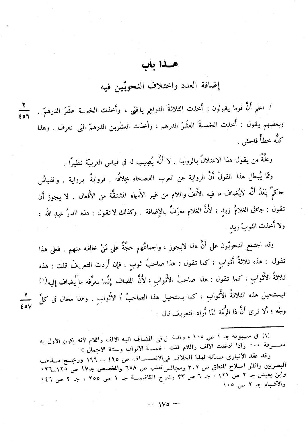 وَمن لم يرد التَّنْوِين خفض فِي هذَيْن الْبَيْتَيْنِ وَمَا أشبههما وَاعْلَم أَن الْقيَاس وَأكْثر كَلَام الْعَرَب أَن تَقول هَذِه أَرْبَعَة عشرك وَخَمْسَة عشرك فتدعه مَفْتُوحًا على قَوْلك هَذِه أَرْبَعَة عشر وَخَمْسَة عشرَة وَقوم من الْعَرَب يَقُولُونَ هَذِه أَرْبَعَة عشرُك ومررت بأَرْبعَة عشرِك وهم قَلِيل وَله وجيه من الْقيَاس وَهُوَ أَن ترده بِالْإِضَافَة إِلَى الْإِعْرَاب كَمَا أَنَّك تَقول ذهب أمس بِمَا فِيهِ وَذهب أمسك بِمَا فِيهِ وَتقول جِئْت من قبل يَا فَتى فَإِذا أضفت قلت من قبلِكَ فَهَذَا مَذْهَبهم وَإِنَّمَا كَانَ الْقيَاس الْمَذْهَب الأول لِأَن خَمْسَة عشر نكرَة وَمَا لم ترده النكرَة إِلَى أَصله لم ترده الْإِضَافَة