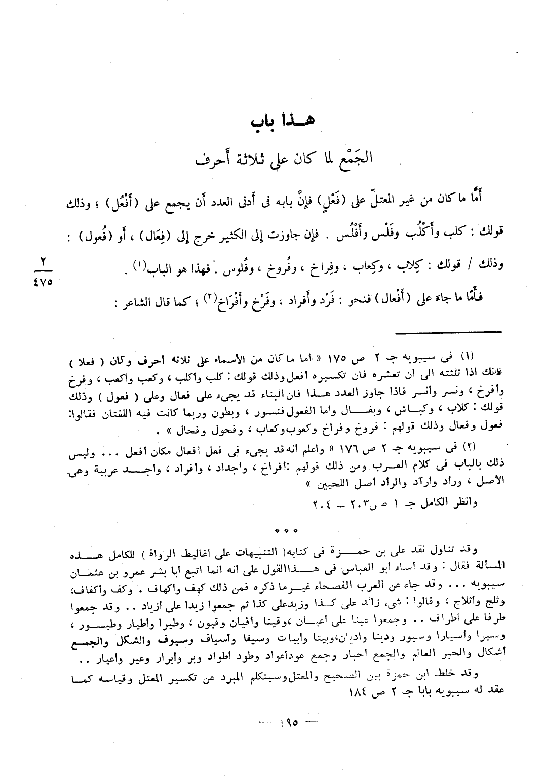 وَكَانَت بَنَات الْيَاء على فعول لِئَلَّا تَلْتَبِس إِحْدَاهمَا بِالْأُخْرَى وَكَانَت الضمة مَعَ الْيَاء أخف وَذَلِكَ قَوْلك بَيت وبيوت وَشَيخ وشيوخ وَقيد وقيود فَأَما قَوْلهم فِي عين أعين فَإِنَّهُ جَاءَ على الأَصْل مثل كلب وأكلب وأعيان على الْبَاب كَمَا قَالَ الشَّاعِر