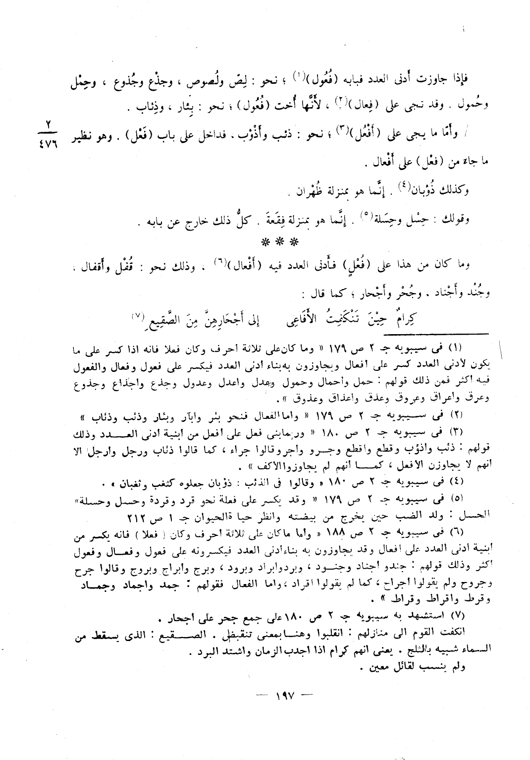 وَتخرج إِلَى فعول نَحْو كبود وكروش وَهُوَ أقل من فعل فَالْأَصْل ألزم وَيكون كَذَلِك فعل نَحْو عضد وأعضاد وَعجز وأعجاز وَيخرج إِلَى فعال نَحْو رجل وَرِجَال وَسبع وسباع كَمَا قَالُوا جمال وَنَحْوه وَلم يَقُولُوا أرجال لقَولهم فِي أدنى الْعدَد رجلة وَمن كَلَامهم الِاسْتِغْنَاء عَن الشَّيْء بالشَّيْء حَتَّى يكون المستغنى عَنهُ مسْقطًا وَلَو احْتَاجَ شَاعِر لجَاز أَن يَقُول فِي رجل أرجال وَفِي سبع أَسْبَاع لِأَنَّهُ الأَصْل وَقد يكون الْبناء فِي الأَصْل للأقل فيشركه فِيهِ الْأَكْثَر كَمَا تَقول أرسان وأقتاب فَلَا يكون جمع غَيره وَقد يكون الْبناء للْأَكْثَر فيشركه الْأَقَل كَمَا تَقول شسوع وسباع فَيكون لكل الْأَعْدَاد وَإِنَّمَا اخْتلف الْجمع لِأَنَّهَا أَسمَاء فَيَقَع الِاخْتِلَاف فِي جمعهَا كالاختلاف فِي أفرادها أَلا أَنا ذكرنَا الْبَاب لندل على مَا يلْزم طَريقَة وَاحِدَة وَالسَّبَب فِي اخْتِلَاف مَا فَارقهَا