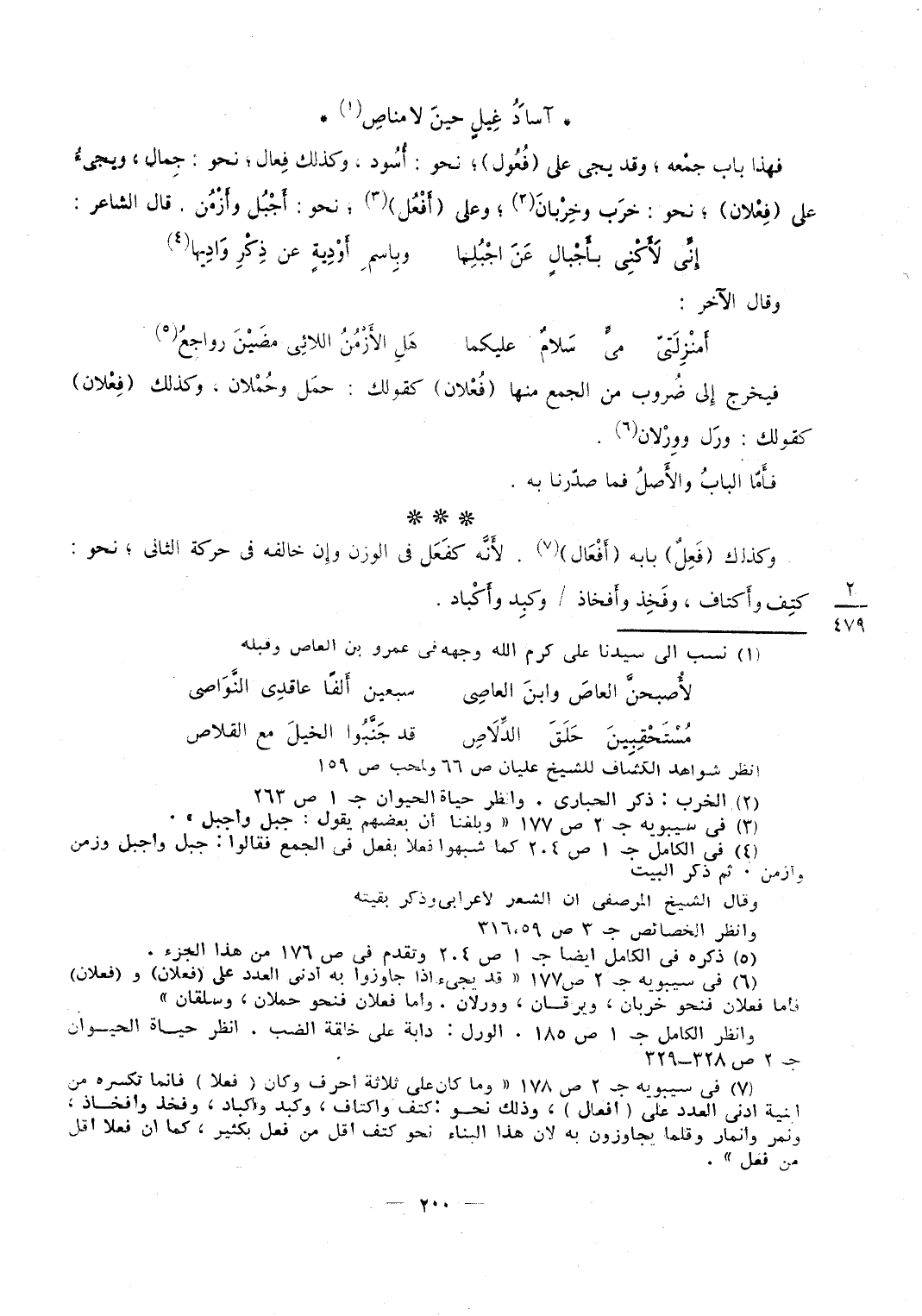 وَقد جَاءَ مِنْهُ شَيْء على أَفعَال شبه بِسَائِر المتحركات من الثَّلَاثَة وَذَلِكَ ربع وأرباع وهبع وأهباع فَهَذَا الَّذِي ذكرت لَك من اخْتِلَاف الْجمع بعد لُزُوم الشَّيْء لبابه إِذْ كَانَ مجَاز الْأَسْمَاء وَكَانَت الْأَسْمَاء على ضروب من الْأَبْنِيَة وَأما مَا كَانَ من المعتل متحركا نَحْو بَاب وَدَار وقاع وتاج فَإِن أدنى الْعدَد فِي ذَلِك أَن تَقول فِيهِ أَفعَال نَحْو بَاب وأبواب وتاج وأتواج وجار وأجوار وقاع وأقواع فَأَما دَار فَإِنَّهُم استغنوا بقَوْلهمْ أدور عَن أَن يَقُولُوا افعال لِأَنَّهُمَا لأدنى الْعدَد والمؤنث يَقع على هَذَا الْوَزْن فِي الْجمع أَلا تراهم قَالُوا ذِرَاع وأذرع وكراع وأكرع وشمال وأشمل ولسان وألسن وَمن ذكر اللِّسَان قَالَ أَلْسِنَة وَمن أنثها قَالَ السُن وَكَذَلِكَ نَار وأنور قَالَ الشَّاعِر