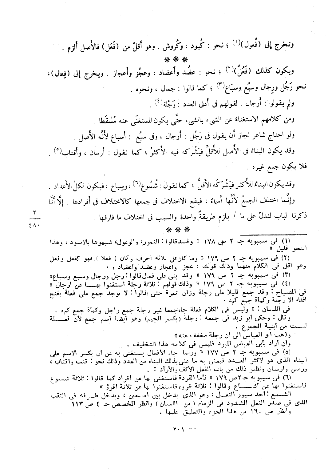 فَإِذا جَاوَزت أدنى الْعدَد فَإِن بَابه فعلان وَذَلِكَ قَوْلك نَار ونيران وقاع وقيعان وتاج وتيجان فَهَذَا الأَصْل وَمَا دخل بعد فعلى جِهَة التَّشْبِيه الَّذِي وصفت لَك وَأما قَوْلهم الْفلك للْوَاحِد والفلك للْجَمِيع فَإِنَّهُ لَيْسَ من قَوْلهم شكاعي وَاحِدَة وشكاعي كثير وبهمى وَاحِدَة وبهمى كثير وَلَكنهُمْ يجمعُونَ مَا كَانَ على فعل كَمَا يجمعُونَ مَا كَانَ على فعل لِكَثْرَة اشتراكهما أَلا تراهم يَقُولُونَ قلفة وقلْفة وصُلعة وصلعة ويلتقيان فِي أُمُور كَثِيرَة فَمن قَالَ فِي أَسد آساد قَالَ فِي فلك أفلاك كَمَا تَقول فِي قفل أقفال وَمن قَالَ فِي أَسد أسْد لزمَه أَن يَقُول فِي جمع فلك فُلك وَنَظِير هَذَا مِمَّا عدده أَرْبَعَة أحرف قَوْلك دلاص للْوَاحِد ودلاص للْجمع وهجان للْوَاحِد وهجان للْجمع وَذَلِكَ لِأَنَّهُ إِذا