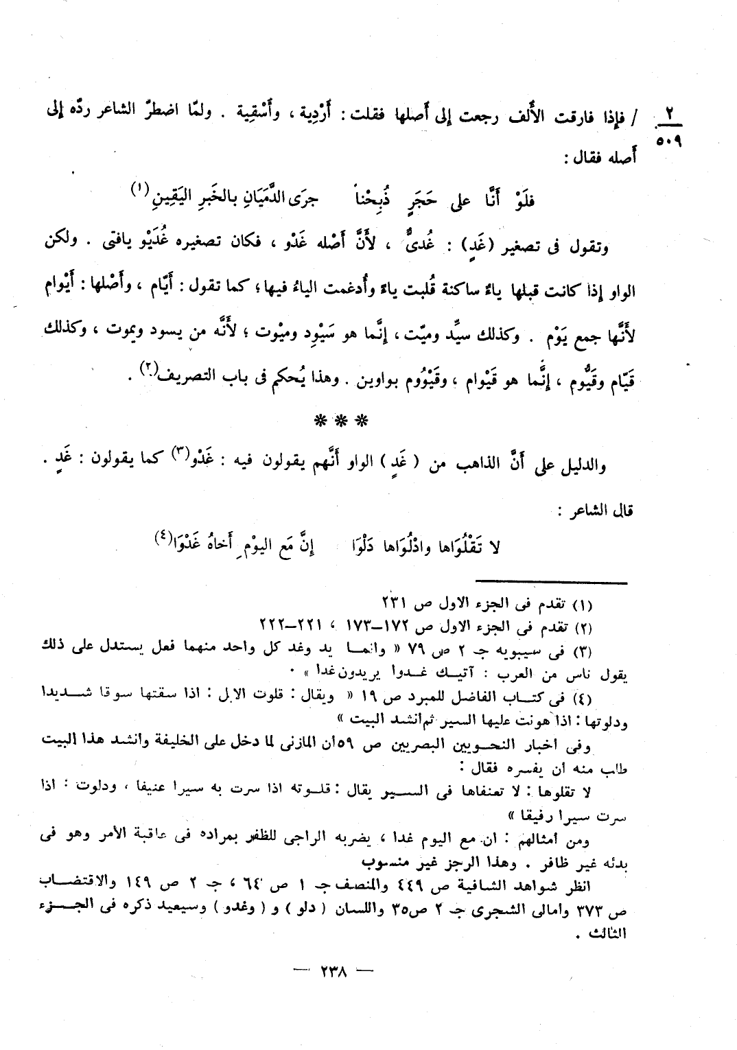فَلَا بُد من رد الثَّالِث فِيهِ فَإِذا رد صَار بِمَنْزِلَة مَا كَانَ على ثَلَاثَة أحرف مِمَّا لم ينقص مِنْهُ شَيْء وَذَلِكَ قَوْلك فِي يَد يدية لِأَن الذَّاهِب كَانَ يَاء يدلك على ذَلِك قَوْلهم يديت إِلَيْهِ يدا وَكَذَلِكَ أياد وكل مَا لم نذكرهُ مِمَّا كَانَ على هَذَا الْمِثَال فَهَذَا قِيَاسه وَاعْلَم أَنَّك إِذا سميت مذكرا بمؤنث لَا عَلامَة فِيهِ إِنَّك لَا تلْحقهُ هَاء التَّأْنِيث إِذا صغرته لِأَنَّك قد نقلته إِلَى الْمُذكر وَذَلِكَ قَوْلك فِي رجل سميته هندا أَو شمسا أَو عينا عيين وشميس وهنيد فَإِن قيل فقد جَاءَ فِي الْأَسْمَاء مثل عُيَيْنَة وأذينة قيل إِنَّمَا سمى بهما الرّجلَانِ بعد أَن صغرتا وهما مؤنثتان وَالدَّلِيل على ذَلِك إِنَّك لم تسم الرجل عينا وَلَا أذنا ثمَّ تأتى بِهَذَا إِذا صغرته إِنَّمَا أول مَا سميت بِهِ عُيَيْنَة وأذينة فَهَذَا بَين جدا وَكَذَلِكَ إِن سميت امْرَأَة أَو مؤنثا غَيرهَا باسم على ثَلَاثَة أحرف مِمَّا يكون للمذكر فَلَا بُد من إِلْحَاق الْهَاء إِذا صغرتها وَذَلِكَ أَنَّك لَو سميت امْرَأَة حجرا أَو عمرا أَو عمر لم تقل فِي تصغيرها إِلَّا عميرَة وحجيرة وَلَا يكون إِلَّا ذَلِك كَمَا لم يكن فِي الْمُذكر إِلَّا مَا وصفت لَك إِذا سميته بمؤنث