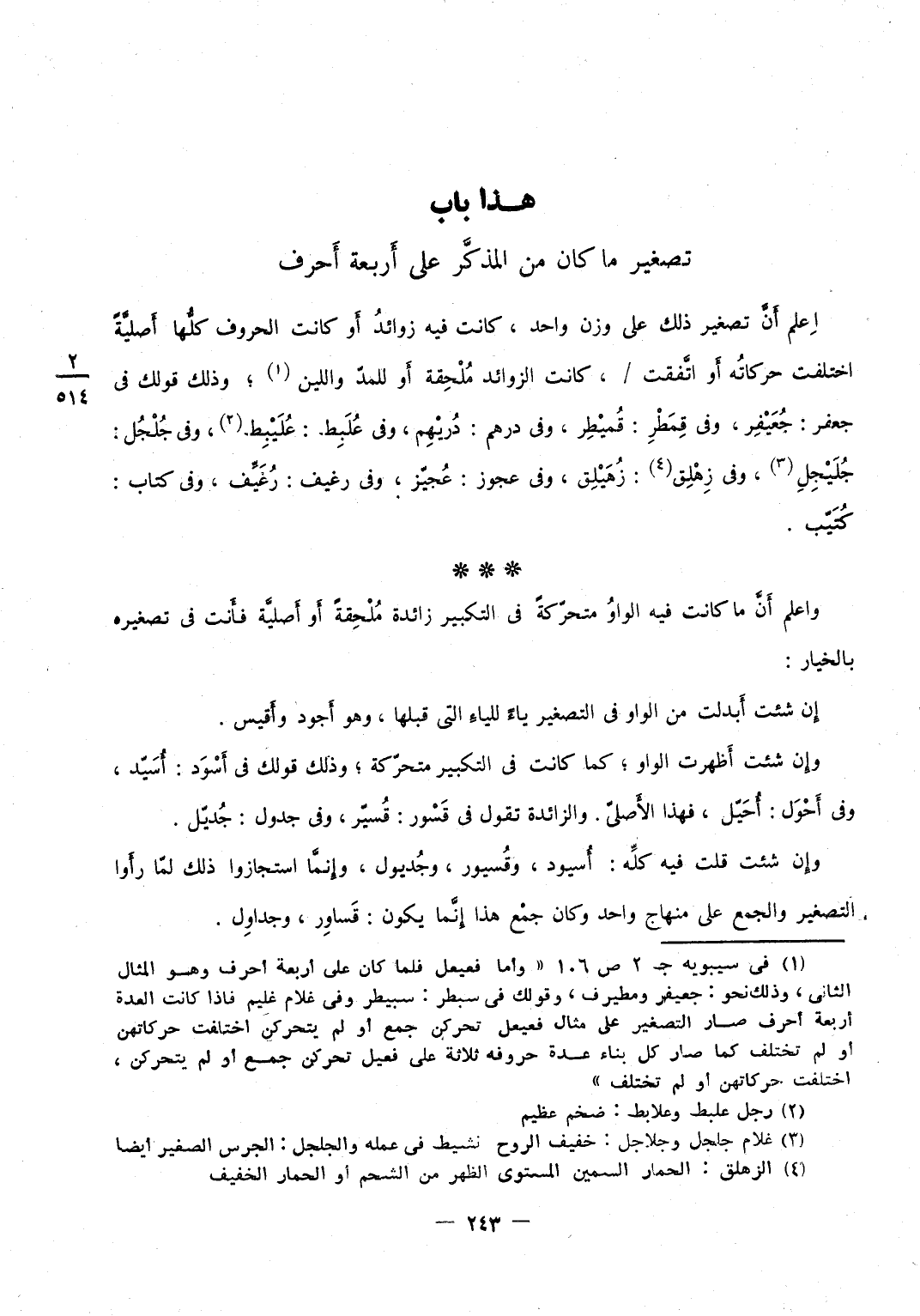 وَتقول فِي تَصْغِير عثول عثيل فَاعْلَم لِأَن فِيهِ زائدتين الْوَاو وَإِحْدَى اللامين وَالْوَاو أَحَق عندنَا بالطرح لِأَنَّهَا من الْحُرُوف الَّتِي تزاد وَاللَّام مضاعفة من الْأُصُول وهما جَمِيعًا للإلحاق بِمثل جردحل وَكَانَ سِيبَوَيْهٍ يخْتَار عثيل وعثيول فِيمَن قَالَ أسيود وَيَقُول هِيَ مُلْحقَة وَهِي أبعد من الطّرف وَقد يجوز مَا قَالَ وَلَكِن الْمُخْتَار مَا ذكرنَا لِلْعِلَّةِ الَّتِي شرحنا