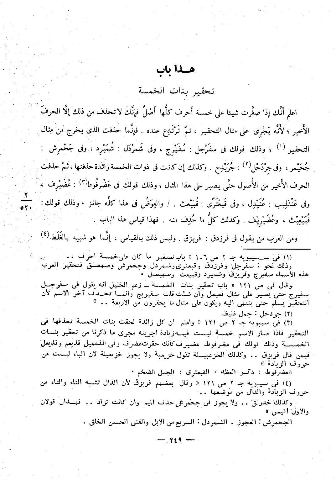 وَكَذَلِكَ مطمئن تَقول طميئن وطميئين إِن عوضت وَتقول فِي مِثَال محرنجم حريجم وحريجيم إِن عوضت فتحذف الْمِيم وَالنُّون لِأَنَّهُمَا زائدتان وَلَا تَجِد من ذَلِك بدا لِأَنَّهُ يبْقى على أَرْبَعَة أحرف وَكَانَ سِيبَوَيْهٍ يَقُول فِي تَصْغِير مقعنسس مقيعس ومقيعيس وَلَيْسَ الْقيَاس