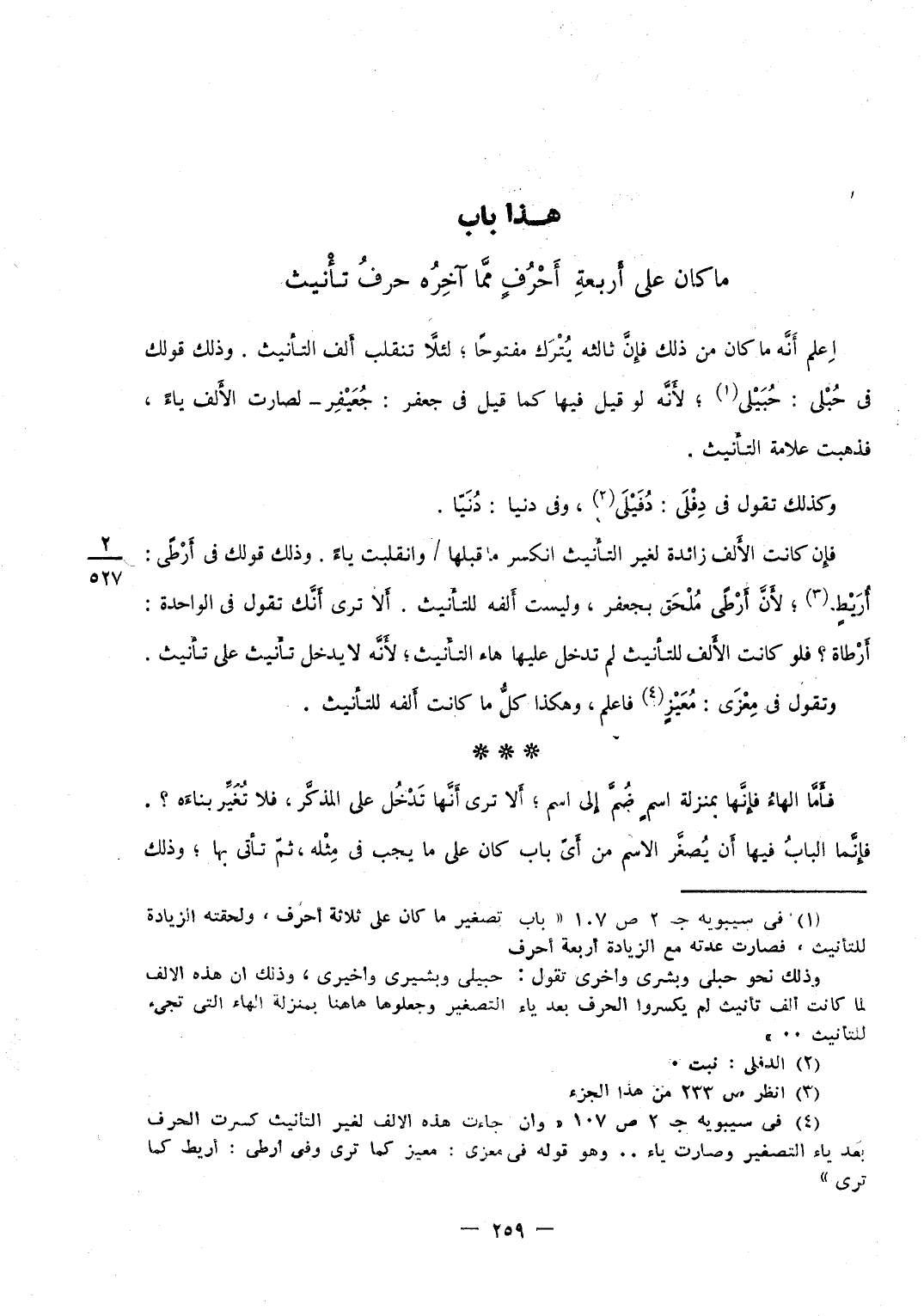 وَلَا قِيَاس إِنَّمَا الْقيَاس أَلا يحذف شَيْئا لِأَنَّك لست تجْعَل ألفى التَّأْنِيث وَلَا الْألف النُّون بِمَنْزِلَة مَا هُوَ فِي الِاسْم وَنحن ذاكرون احتجاجه والاحتجاج عَلَيْهِ إِن شَاءَ الله حجَّته انه يَقُول إِذا وَقعت الْألف ثَالِثَة فِي مَوضِع ألف مبارك حذفت لِكَثْرَة الْعدَد وَذَلِكَ أَن الْألف وَالنُّون ليستا مِمَّا يجوز حذفه وهما كهاء التَّأْنِيث فِي اللُّزُوم وليستا بمنزلتهما فِي أَنَّهُمَا كاسم ضم إِلَى اسْم فتحقر الصَّدْر وتترك مَا بعده ولكنهما بِمَنْزِلَة مَا هُوَ من الِاسْم فَيُقَال لَهُ إِن كَانَتَا بِمَنْزِلَة مَا هُوَ من الِاسْم وَجب عَلَيْك أَلا تحقر ماهما فِيهِ إِذا كَانَ على سِتَّة أحرف بهما وَإِن كَانَتَا بِمَنْزِلَة شَيْء ضم إِلَى الصَّدْر وَجب أَن يحقر مَا قبلهمَا كَمَا تفعل ذَلِك بِمَا قبل الْهَاء ثمَّ تَأتي بهما كَمَا تَأتي بِالِاسْمِ الْأَخير بعد الأول فِي مثل حَضرمَوْت ومعد يكرب وَكَذَلِكَ حكم ألف التَّأْنِيث وياء النّسَب كهاء التَّأْنِيث أَلا ترى أَنَّك تَقول فِي زعفران زُعيفران فَلَو كَانَت الْألف وَالنُّون كاللام فِي سفرجل لَكَانَ هَذَا التحقير محالا وَلَكِنَّك تَقول فِي خنفساء خنيفساء وَفِي مدائني مديئني فَإِنَّمَا حق هَذَا مَا ذكرت لَك أَلا ترى أَن مَا قبل الْألف وَالنُّون فِي التحقير إِذا لم يكن مُلْحق الْجمع مَفْتُوح وَمَا قبل ألفي التَّأْنِيث لَا يكون إِلَّا مَفْتُوحًا كَمَا يكون مَا قبل الْهَاء فَهَذَا بَين جدا