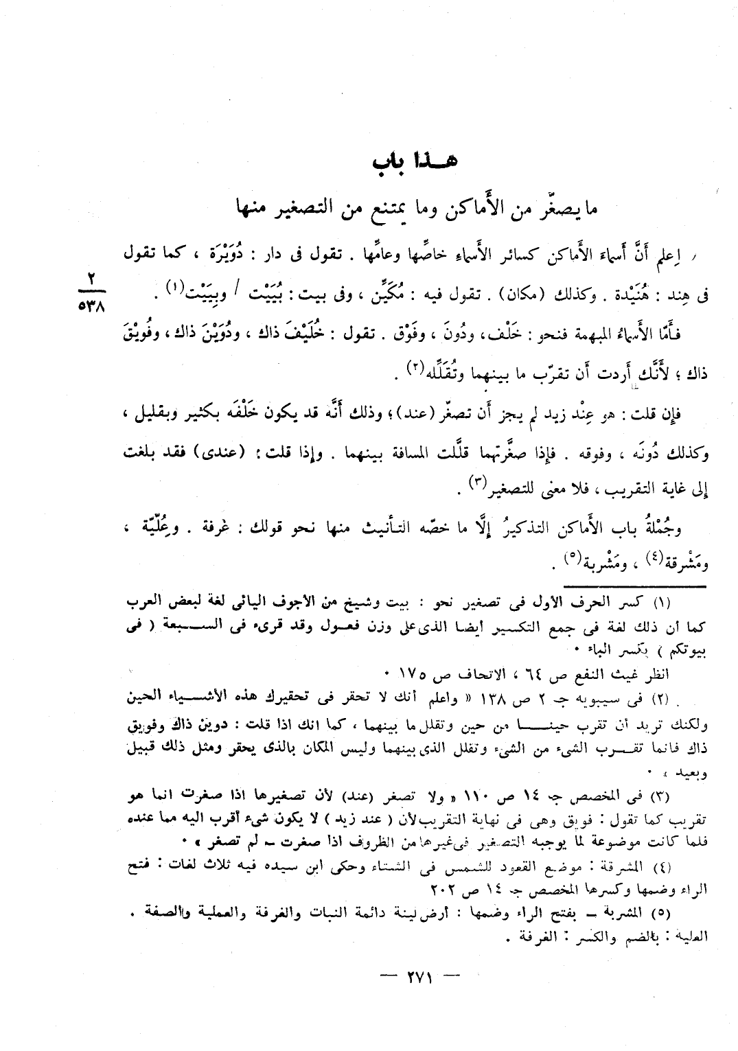 وَالزَّمَان خَاصَّة وَعَامة يتَّصل بِهِ الْفِعْل وَذَلِكَ أَن العفل إِنَّمَا بني لما مضى من الزَّمَان وَلما لم يمض فَإِذا قلت ذهب علم أَن هَذَا فِيمَا مضى من الزَّمَان وَإِذا قلت سيذهب علم أَنه لما لم يَأْتِي من الزَّمَان وَإِذا قلت هُوَ يَأْكُل جَازَ أَن تَعْنِي مَا هُوَ فِيهِ وَجَاز أَن تُرِيدُ هُوَ يَأْكُل غَدا وَالْمَكَان لَا يكون فِيهِ مثل ذَلِك فالفعل يَنْقَضِي كالزمان لِأَن الزَّمَان مُرُور الْأَيَّام والليالي فالفعل على سنَنه يمْضِي بمضيه وَلَيْسَت الْأَمْكِنَة كَذَلِك إِنَّمَا هِيَ جثث ثَابِتَة تفصل بَينهَا بِالْعينِ وتعرف بَعْضهَا من بعض كَمَا تعرف زيد من عَمْرو فَكل مُتَمَكن من الزَّمَان يصغر تَقول يويم فِي تَصْغِير يَوْم وعويم فِي تَصْغِير عَام وَإِنَّمَا صغرته بِالْوَاو دون الْيَاء لِأَن أَلفه منقلبة من وَاو يدلك على ذَلِك أَعْوَام قَوْلك عاومت النَّخْلَة وَهَذَا يشْرَح فِي بَاب على حياله بِجَمِيعِ علله إِن شَاءَ الله وَكَذَلِكَ كل مَا كَانَ مثله يرد فِي التصغير إِلَى أَصله تَقول فِي ليل لييل فَأَما لييلية فلهَا عِلّة نذكرها فِي بَابهَا إِن شَاءَ الله