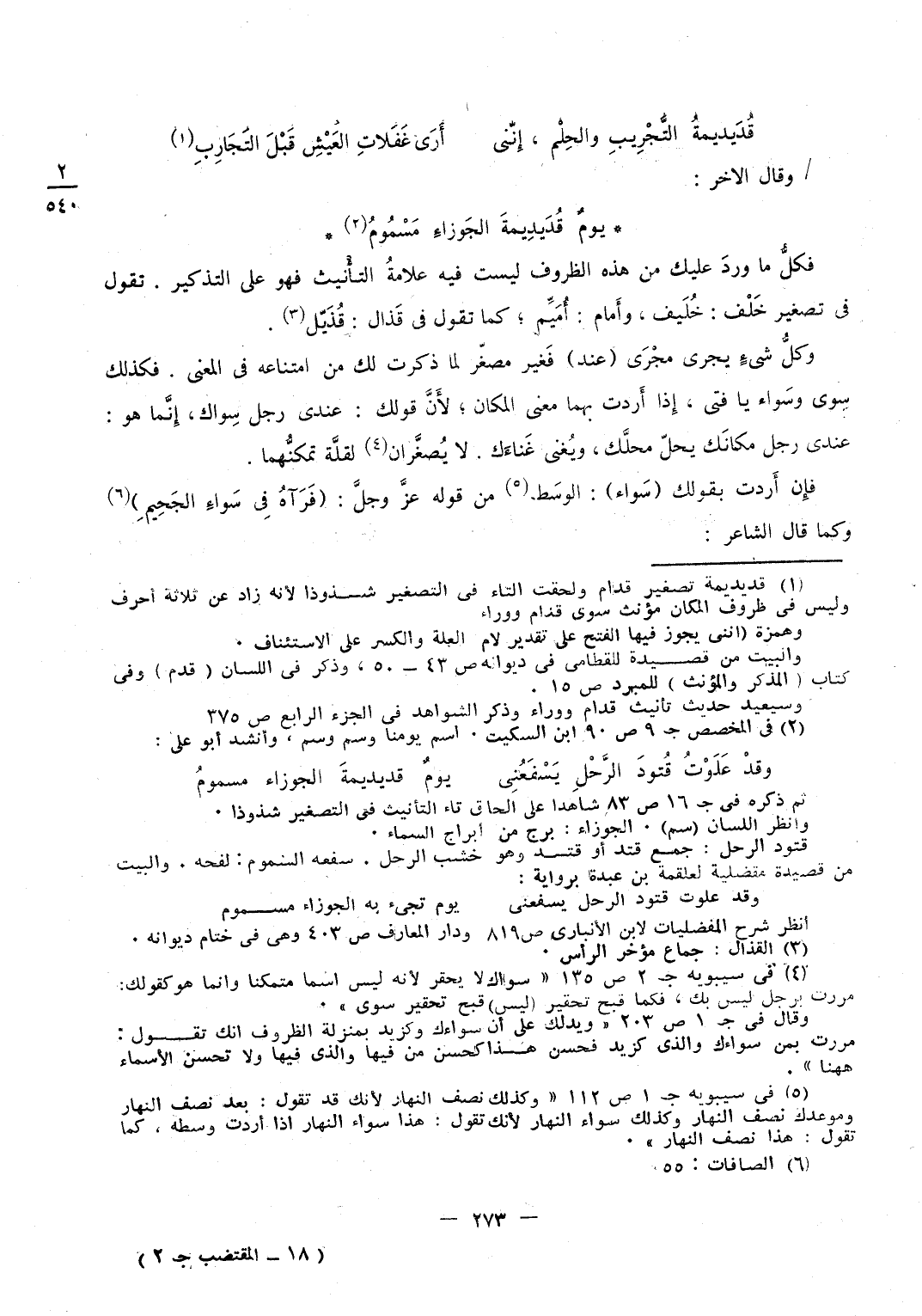 أحيد فِي الِاثْنَيْنِ ثنيان لِأَن الْألف ألف وصل فَهِيَ بِمَنْزِلَة قَوْلك فِي ابْن بني وَفِي اسْم سمي وَفِي الثُّلَاثَاء ثليثاء فِي قَول سِيبَوَيْهٍ وَفِي قَوْلنَا ثليثاء لِأَنَّك إِنَّمَا صغرت ثَلَاثًا فتسلم الصَّدْر ثمَّ تَأتي بعده بألفي التَّأْنِيث وَفِي الْأَرْبَعَاء الأريبعاء وَفِي الْخَمِيس الخُميس وَفِي الْجُمُعَة جميعة وَكَذَلِكَ الشُّهُور تَقول فِي الْمحرم محيرم تحذف إِحْدَى الراءين حَتَّى تصير على مِثَال جَعْفَر فَإِن عوضت قلت محيريم وَفِي صفر صفير وَفِي ربيع رُبيع وَفِي جمادي أَنْت مُخَيّر إِن شِئْت قلت جميدي وَهِي أَجود وَإِن شِئْت قلت جميد وَتَفْسِيره كتفسير حباري وَفِي رَجَب رُجيب وَفِي شعْبَان شُعيبان وَكَذَلِكَ رَمَضَان رُميضان وَفِي شَوَّال شويويل لِأَنَّهُ فعال مثل حَمَّاد وَفِي ذِي الْقعدَة ذُوي الْقعدَة لِأَن التصغير إِنَّمَا يَقع على الِاسْم الأول أَلا ترى أَنَّك لَو صغرت غُلَام زيد لَقلت غليم زيد فَكَذَلِك هَذَا وَمَا أشبههه وَتقول فِي أَسمَاء الْأَوْقَات من اللَّيْل وَالنَّهَار كَذَلِك تَقول فِي تَصْغِير سَاعَة سويعة وَفِي غدْوَة غدية وَفِي بكرَة بكيرة وَفِي ضحوة ضحية وَفِي ضحى ضُحي وَكَذَلِكَ تَصْغِير
