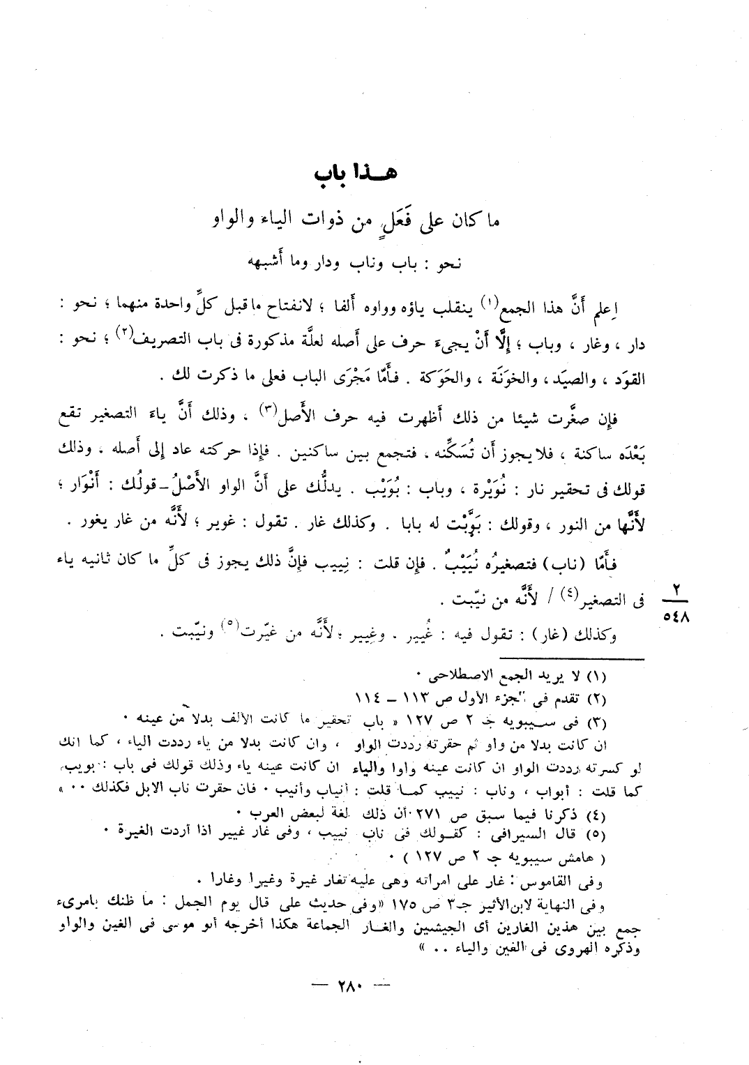 وَأما الْأَصْلِيَّة المنقلبة فَهُوَ مقَام ومقال لاتقول فيهمَا إِلَّا مُقيم ومقيل لِأَنَّك كنت تخْتَار فِي الظَّاهِرَة المتحركة الْقلب للياء الَّتِي قبلهَا فَلم يكن فِي الساكنة والمبدلة إِلَّا مَا ذكرت لَك وَاعْلَم أَنه من قَالَ فِي أسود أسيود قَالَ فِي مُعَاوِيَة معيوية لِأَن الْوَاو فِي مَوضِع الْعين وَمن قَالَ أسيد على اخْتِيَار الْوَجْه قَالَ معية فيحذف الْيَاء الَّتِي حذفهَا فِي تَصْغِير عَطاء وَنَحْوه لِاجْتِمَاع الياءات وَمن كَانَت أروى عِنْده أفعل قَالَ فِي تصغيره أرية مثل قَوْلك أسيد وَمن قَالَ أسيود قَالَ أريوية وَمن كَانَت عِنْده فعلى لم يقل فِي أروية إِلَّا أرية لِأَن الْوَاو فِي مَوضِع اللَّام على هَذَا القَوْل وَإِلَيْهِ كَانَ يذهب الْأَخْفَش وَالْأول قَول سِيبَوَيْهٍ