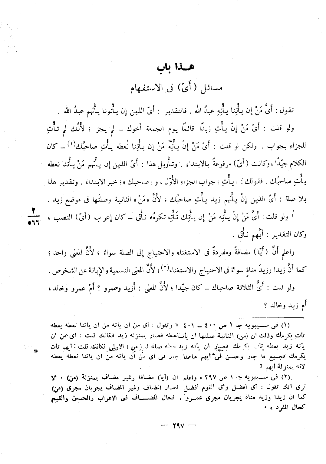 وَلَو قلت أَي من يأتني آته كَانَ محالا لِأَنَّك إِذا أضفت أيا إِلَى من لم تكن من إِلَّا بِمَنْزِلَة الَّذِي فان قلت أجعَل أيا استفهاما وَأَجْعَل من جَزَاء فقد أحلّت لِأَنَّك إِذا أضفت إِلَى الْجَزَاء اسْما دخله الْجَزَاء أَلا ترى أَنَّك تَقول غُلَام من يأتك تأته فَيصير الْجَزَاء للغلام صلَة فَإِن قلت فأجعل أيا بِمَنْزِلَة غُلَام قيل لَا يكون كَذَلِك إِلَّا أَن توصل لِأَنَّهَا إِذا لم تكن جَزَاء أَو استفهاما لم تكن إِلَّا مَوْصُولَة فَإِن قلت اجْعَلْهَا استفهاما \ قيل قد أحلّت لِأَنَّك قد جَعلتهَا جَزَاء واستفهاما فِي حَال وَمَتى كَانَت فِي إِحْدَاهمَا بَطل الآخر فَإِن قلت أرفع فَأَقُول أَي من يأتني آتيه فَذَلِك جيد لِأَنَّك جعلت يأتيني صلَة وآتيه خَبرا وأيا استفهاما فكأنك قلت أَي الْقَوْم آتيه وَلَو فصلت أيا من مَنْ لجَاز فَقلت أَي من يأتني آته فَكَانَت أَي استفهاما وَمن للجزاء وَكَذَلِكَ لَو قلت مَن منْ يأتنا نكرمه لَكَانَ جيدا تجْعَل الْهَاء فِي نكرمه رَاجِعَة إِلَى من الأولى فَيكون التَّقْدِير من الرجل الَّذِي من أَتَانَا من النَّاس أتيناه