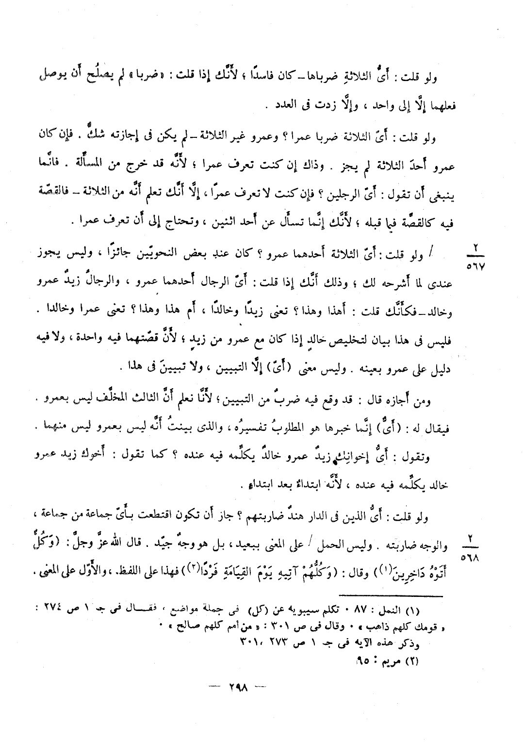 إِذا قَالَ لَك رجل رَأَيْت رجلا قلت أيا وَذَلِكَ أَنَّك أردْت أَن تحكي كَلَامه فَإِن قَالَ جَاءَنِي رجل قلت أَي مَوْقُوفَة فَإِن وصلت قلت أَي يَا فَتى لِأَنَّهَا مَرْفُوعَة كَالَّذي استفهمت عَنهُ فَإِن قَالَ مَرَرْت بِرَجُل قلت فِي الْوَقْف أَي مَوْقُوف كَمَا تَقول فِي المخفوض مَرَرْت بزيد فَإِن وصلت قلت أَي / يافتى فَإِن قَالَ جَاءَتْنِي امْرَأَة قلت أَيَّة فَإِن وصلت قلت أَيَّة يَا فَتى وَكَذَلِكَ النصب والخفض تنصب إِذا نصب وتخفض إِذا خفض حِكَايَة لقَوْله وتقف بِلَا حَرَكَة وَلَا تَنْوِين فَإِن ثنى فَقَالَ جَاءَنِي رجلَانِ قلت أَيَّانَ فَإِن قَالَ رَأَيْت رجلَيْنِ أَو مَرَرْت برجلَيْن قلت أيين على حِكَايَة كَلَامه وَإِن قَالَ جَاءَنِي امْرَأَتَانِ قلت أيتان وَفِي النصب والخفض أيتين وتكسر النُّون فِي الْوَصْل لِأَنَّهَا نون الِاثْنَيْنِ فَإِن قَالَ جَاءَنِي رجل قلت أيون فَإِن وصلت فتحت النُّون